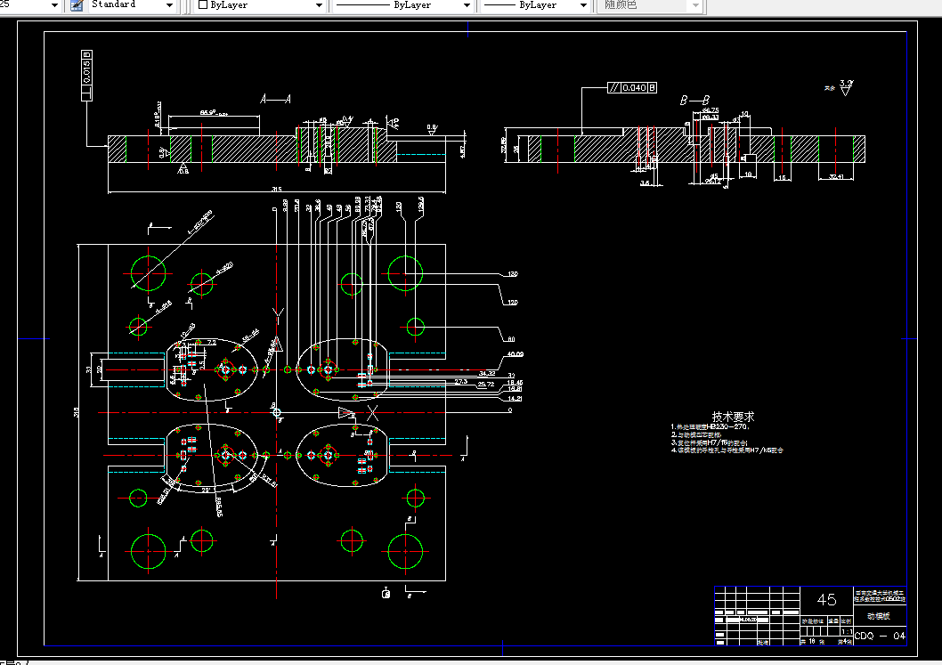 由于塑件的外形轮廓及内部结构较为复杂,因此在该设计中采用一模四腔,对称平衡式布置,型芯型腔大量使用镶嵌件,以减少生产成本,保证塑件制品的加工成型。同时盖的下端面需考虑侧向分型抽芯,这里采用的是斜导柱滑块外侧抽芯,足以保证塑件制品的分型取出。在设计方面,主要进行了注射成形的基本过程、塑件结构分析及材料的选择、拟定模具结构形式、模具材料的选用、模架的选择、排气系统设计、温度调节系统的设计;在计算方面,主要进行了注射机型号的选择及相关参数的校核、浇注系统的设计、成型零件设计、侧向分型与抽芯机构设计、温度调节系统的设计;在编程方面,选择一个具有代表性的成型零件,如:动模座板进行NC编程。该模具结构设计紧凑合理,开合模顺畅,便于加工装配。