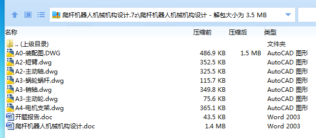 本次设计的是爬杆机器人的机械结构,主要有驱动机构,减速器,夹紧机构,爬升机构。驱动机构主要是由电机和联轴器组成。减速器主要是由减速齿轮或是蜗杆减速机构组成,通过对小车爬行时所需要的最大扭矩的估算进行减速器的选择和尺寸设计。夹紧机构主要是由弹簧、轮架、车轮等组成,这部分主要根据对轮轴所能承受的强度来进行轴径的计算。爬升机构是由驱动轮、传动轴、轴承、套筒等零件组成。