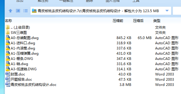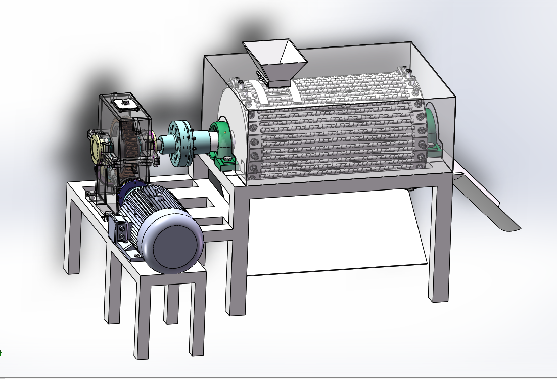 青皮核桃去皮是对核桃初加工的第一步。为了设计适合的青皮核桃去皮机,本文首先通过理论学习与实物研究相结合的办法,对部件加深认识与理解,根据青皮核桃的的力学性能,整体机器的大小及工作效率等综合因素来选择电动机。再根据研究目的与背景来确定合适的方案。机器的执行部分拟采用摩擦与挤压一起作用的方法进行设计,主轴通过减速器降速带动。对于果壳与果皮的分离,同已有的青皮核桃脱皮机进行比较,继而选择分离方法。在设计中对一些设计参数与尺寸将通过参考同类机器的尺寸进行选取设计。对青皮核桃摩擦挤压运动的设计,要对青皮核桃的力学性能进行分析,满足青皮的剪切力但又不超过核桃壳的强度极限。再确定机器各项参数,计算各元件的参数和尺寸,在理论分析的基础上,运用Solidworks建模,设计核桃脱皮机整机结构、关键部件及传动系统。最后完成二维制图。