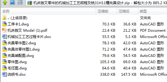 本次设计是车床变速箱中拔叉零件的加工工艺规程及一些工序的专用夹具设计。此拔叉零件的结构较为复杂,其加工的地方主要是孔和平面。本设计先加工孔后加工面。将孔与平面的加工明确划分成粗加工和精加工阶段以保证它们的加工精度。基准选择以拔叉Φ32外圆作为粗基准,来加工中间的通孔,然后以此加工过的孔作为精基准。主要加工工序安排是先以中心孔定位加工出顶平面和右侧平面以及下面的大孔的两平面,再以中心孔定位加工出下端的大孔。加工时是用镗床镗孔。最后以这两个孔为基准,分别加工右侧的槽和顶面的螺纹底孔。整个加工过程选用了钻床、铣床和镗床。工件在机床上定位夹紧选用专用夹具,夹紧方式为手动夹紧,夹紧可靠,操作方便。因此生产效率较高,适用于大批量、流水线上加工。能够满足设计要求。