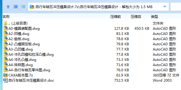 本次设计对国内外冲压模具的现状和发展进行了比较综合的阐述,根据零件的具体结构,在充分分析其各工序成型工艺特点的基础上,对自行车轴瓦零件的加工过程进行了计算和研究;这次设计采用了冲压模具,使用了一套模具完成整个零件的成型,工序过程包括落料,拉伸,冲孔的复合模。轴瓦的冲压加工是最基本、最传统、最重要的金属加工方法之一,轴瓦的设计是通过仔细地计算参数、充分地运用冲压模具手册和对零件的设计难点的独立思考和理论知识的综合运用,对所设计的模具进行了分析校正与调试,可以满足所需要的设计要求。在设计过程中除了设计说明书外,还包括模具的装配图,非标准零件的零件图和排样图。