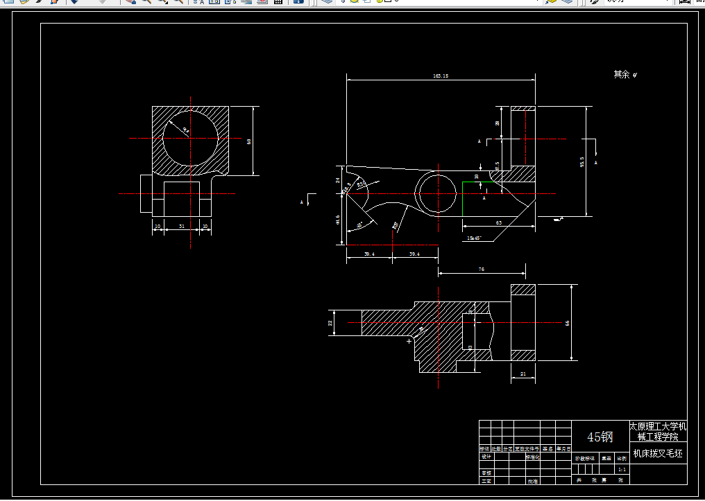 本次设计是车床变速箱中拔叉零件的加工工艺规程及一些工序的专用夹具设计。此拔叉零件的结构较为复杂,其加工的地方主要是孔和平面。本设计先加工孔后加工面。将孔与平面的加工明确划分成粗加工和精加工阶段以保证它们的加工精度。基准选择以拔叉Φ32外圆作为粗基准,来加工中间的通孔,然后以此加工过的孔作为精基准。主要加工工序安排是先以中心孔定位加工出顶平面和右侧平面以及下面的大孔的两平面,再以中心孔定位加工出下端的大孔。加工时是用镗床镗孔。最后以这两个孔为基准,分别加工右侧的槽和顶面的螺纹底孔。整个加工过程选用了钻床、铣床和镗床。工件在机床上定位夹紧选用专用夹具,夹紧方式为手动夹紧,夹紧可靠,操作方便。因此生产效率较高,适用于大批量、流水线上加工。能够满足设计要求。
