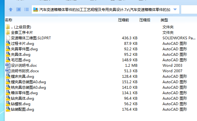 本次设计是汽车变速箱箱体零件的加工工艺规程及一些工序的专用夹具设计。汽车变速箱箱体零件的主要加工表面是平面及孔系。保证平面的加工精度要比保证孔系的加工精度容易。因此,本设计遵循先面后孔的原则。并将孔与平面的加工明确的划分为粗加工和精加工阶段,以保证孔系的加工精度。基准选择以变速箱箱体的输入轴与输出轴的支承孔作为粗基准,以顶面与两个工艺孔作为精基准。主要加工工序安排先以支承孔系定位加工出上表面。再以顶平面与支承孔系定位加工出孔。整个加工过程均选用组合机床,夹具选用专用夹具夹紧。加紧方式多选用手动夹紧,夹紧可靠。