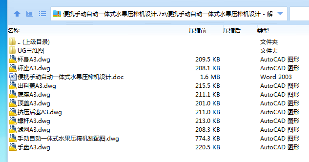 人们日常生活中所使用的各种类型产品的要求也逐渐升高,特别的对那些日常生活密切相关的类电器产品---因为人们每天的起居饮食都离不开这类产品。人们对生活的品质也越来越挑剔,随之一些大型的生产生活的机械纷纷都对机械进行改进,产生了各种家用的生活生产机器。便携手动自动一体式水果压榨机的设计,由于在人们的日常生活中使用起来非常的方便快捷,逐渐受到大部分人们的喜爱,当然这类产品在使用功能和外形美观方面都是缺一不可的。