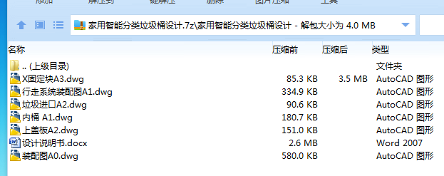 (1) 基于SolidWorks进行设备模型设计,包括:内桶、垃圾自动打包装置、分类投递装置、整体运动装置等零部件设计,对垃圾桶整机结构进行零件建模和虚拟装配,完成装置装配检验和运动仿真。