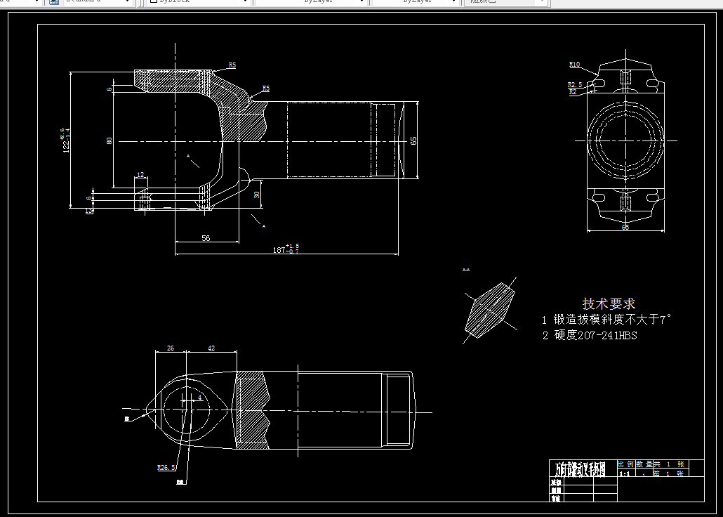 万向节滑动叉位于传动轴的端部。它的主要作用:一是传递扭矩,使汽车获得前进的动力;二是当汽车后桥钢板弹簧处在不同的状态时,由本零件可以调整传动轴的长短及其位置。零件的两个叉头部位上有两个孔,用以安装滚针轴承并与十字轴相连,起万向联轴节的作用。零件上的花键孔与传动轴端部的花键轴相配合,用于传递动力之用。