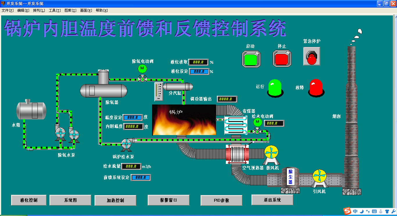 设计采用前馈反馈控制来实现锅炉内胆的温度控制。其中前馈控制用于补偿干扰对被控变量的扰动,前馈控制后产生的余差,通过反馈控制进行修正,用来达到要求的控制精度。通过检测锅炉的内胆温度,跟设定的温度进行比较,采用PLC内部的PID调节控制加热。通过读取当前液位,跟设定液位进行比较,PLC进行PID调节控制调节阀开度,进行液位控制。通过检测流量,设定流量前馈系数,通过计算得到流量前馈,直接控制加热调功器输出,用于控制加热