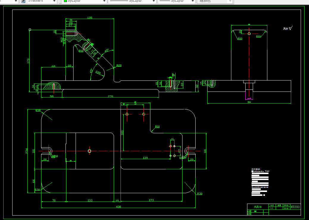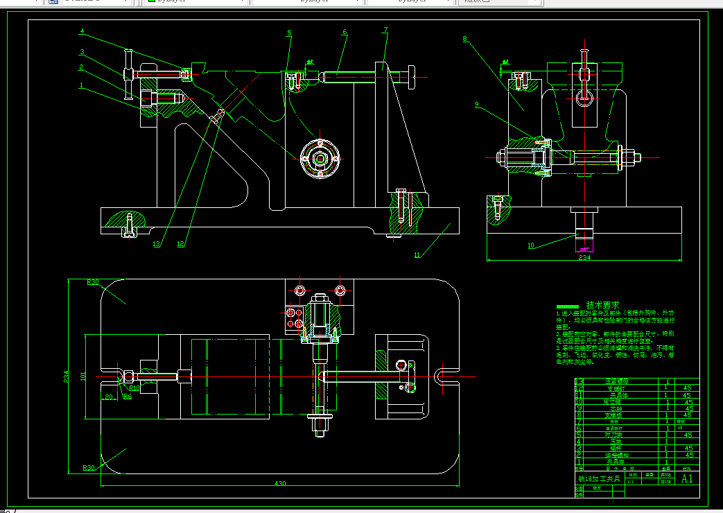 本课题主要是设计某机床尾座体支架B的加工工艺及夹具的设计,在设计中采用先设计该尾座体支架B的加工工艺在根据加工工艺来选取夹具的设计的方案和夹具的具体设计;而设计的重点是夹具的设计。由于工件的孔17和14都要以底面做为基准加工,故首先得做出底面的加工夹具。由于孔17的精度要求高,和定位尺寸误差小,为保证孔的位置和加工准确性我们一定在加工底面的时间通过画线找出底面的加工余量。这样就可以更好的保证孔17的位置和加工精度!加工孔14的夹具其实就是在加工底面夹具的基础上加了一个45度斜度板。加工孔17的时间为保证相对于A和B面的平行度我们就得要准确的设计出以A和B面定为的夹具!还考虑到工件的圆度和圆柱度的误差小,我们设计的夹具就具有对孔17的夹具定位准确,和加工时间的震动小,那就得在孔17的附近找个定位加紧点!