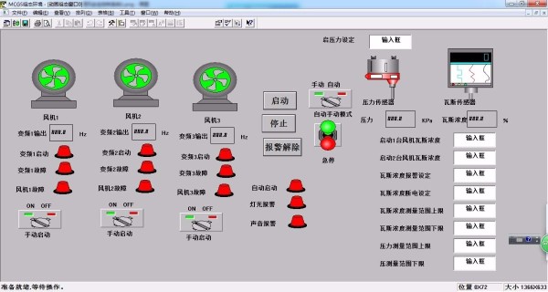 本设计进行了PLC的控制,同时进行了组态设计,PLC系统配合上位机进行矿井通风控制,效果很好,可以进行数据采集,实时和历史数据查询,实时和历史报警查询,进行参数设定,手动自动控制,实时监控系统状态等。