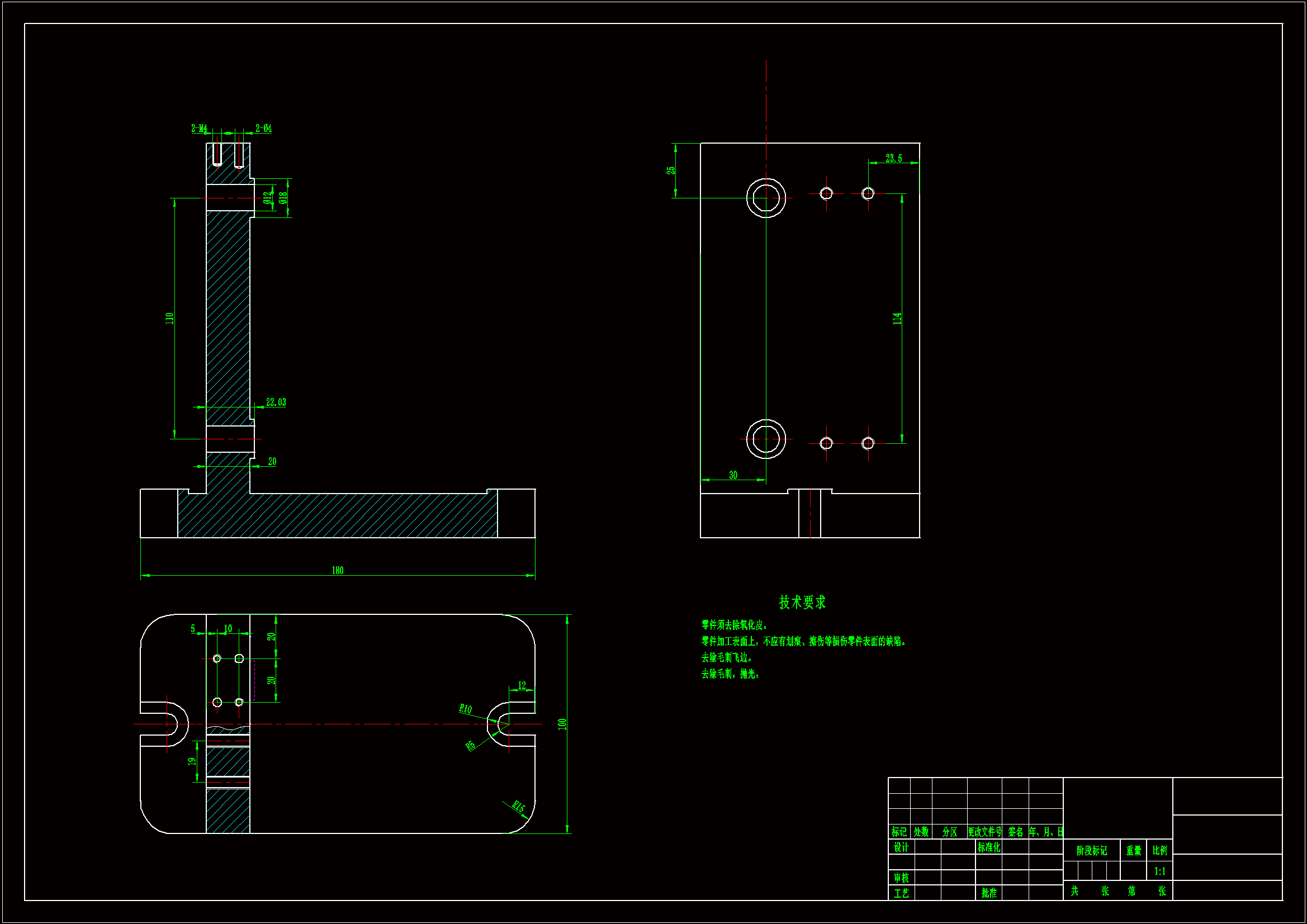 支架加工工艺规程及钻孔的夹具设计是包括零件加工的工艺设计、工序设计以及专用夹具的设计三部分。在工艺设计中要首先对零件进行分析,了解零件的工艺再设计出毛坯的结构,并选择好零件的加工基准,设计出零件的工艺路线;接着对零件各个工步的工序进行尺寸计算,关键是决定出各个工序的工艺装备及切削用量;然后进行专用夹具的设计,选择设计出夹具的各个组成部件,如定位元件、夹紧元件、引导元件、夹具体与机床的连接部件以及其它部件;计算出夹具定位时产生的定位误差,分析夹具结构的合理性与不足之处,并在以后设计中注意改进。