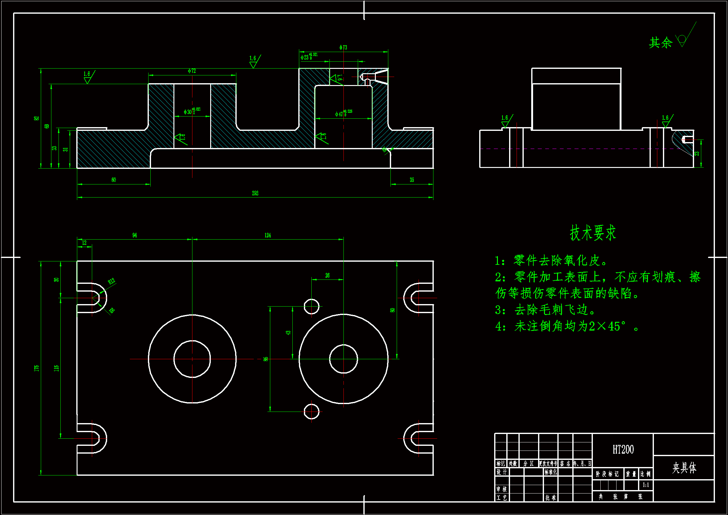 底座加工工艺规程及其钻孔的夹具设计是包括零件加工的工艺设计、工序设计以及专用夹具的设计三部分。在工艺设计中要首先对零件进行分析,了解零件的工艺再设计出毛坯的结构,并选择好零件的加工基准,设计出零件的工艺路线;接着对零件各个工步的工序进行尺寸计算,关键是决定出各个工序的工艺装备及切削用量;然后进行专用夹具的设计,选择设计出夹具的各个组成部件,如定位元件、夹紧元件、引导元件、夹具体与机床的连接部件以及其它部件;计算出夹具定位时产生的定位误差,分析夹具结构的合理性与不足之处,并在以后设计中注意改进。