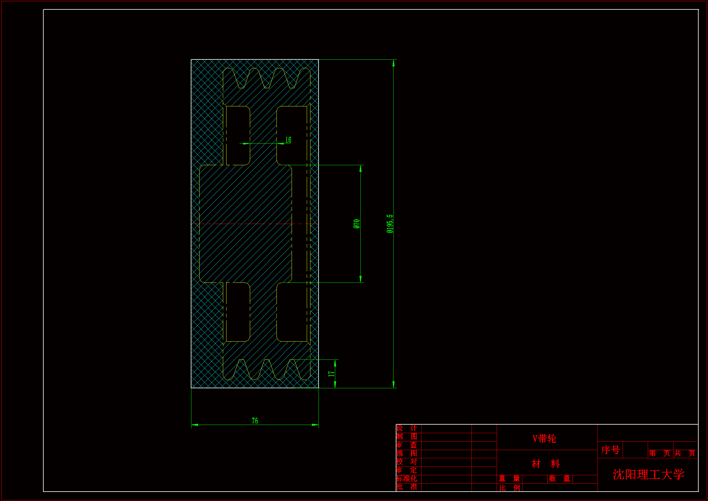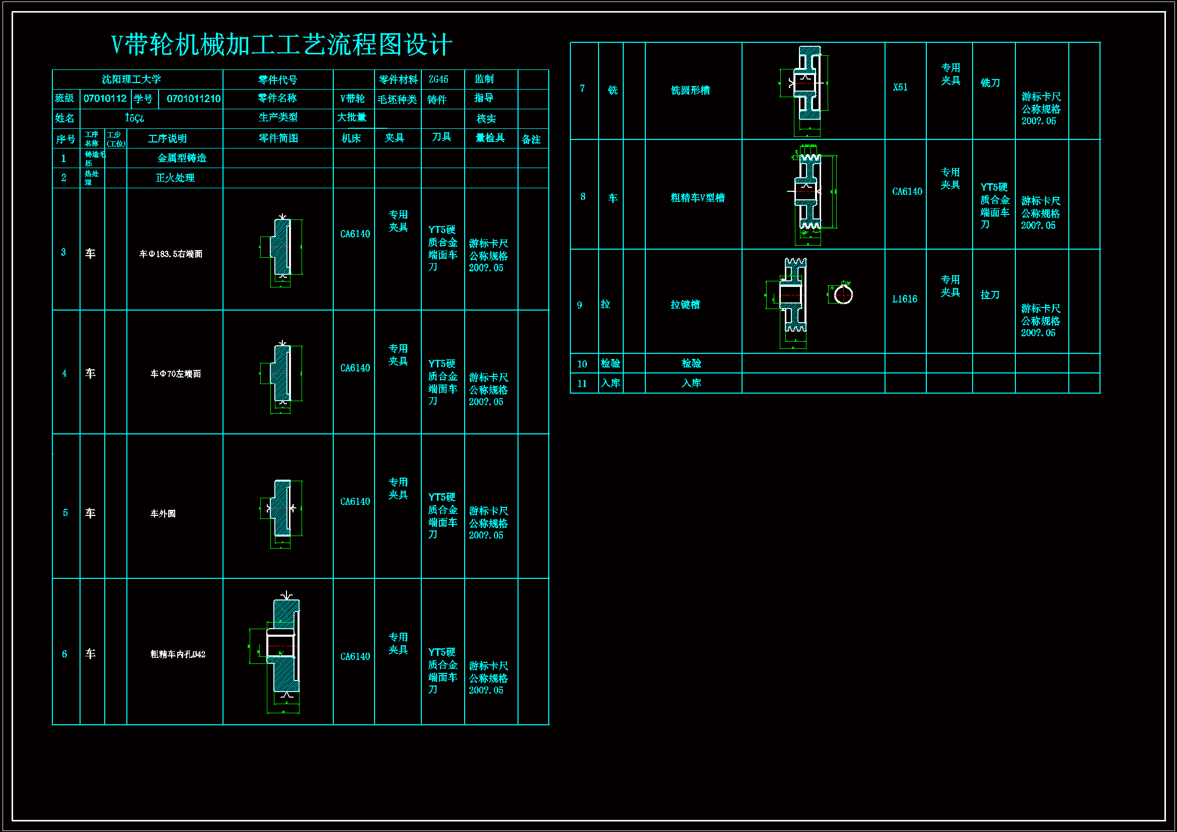 本次设计内容涉及了机械制造工艺及机床夹具设计、金属切削机床、公差配合与测量等多方面的知识。V带轮加工工艺规程及其夹具设计是包括零件加工的工艺设计、工序设计以及专用夹具的设计三部分。在工艺设计中要首先对零件进行分析,了解零件的工艺再设计出毛坯的结构,并选择好零件的加工基准,设计出零件的工艺路线;接着对零件各个工步的工序进行尺寸计算,关键是决定出各个工序的工艺装