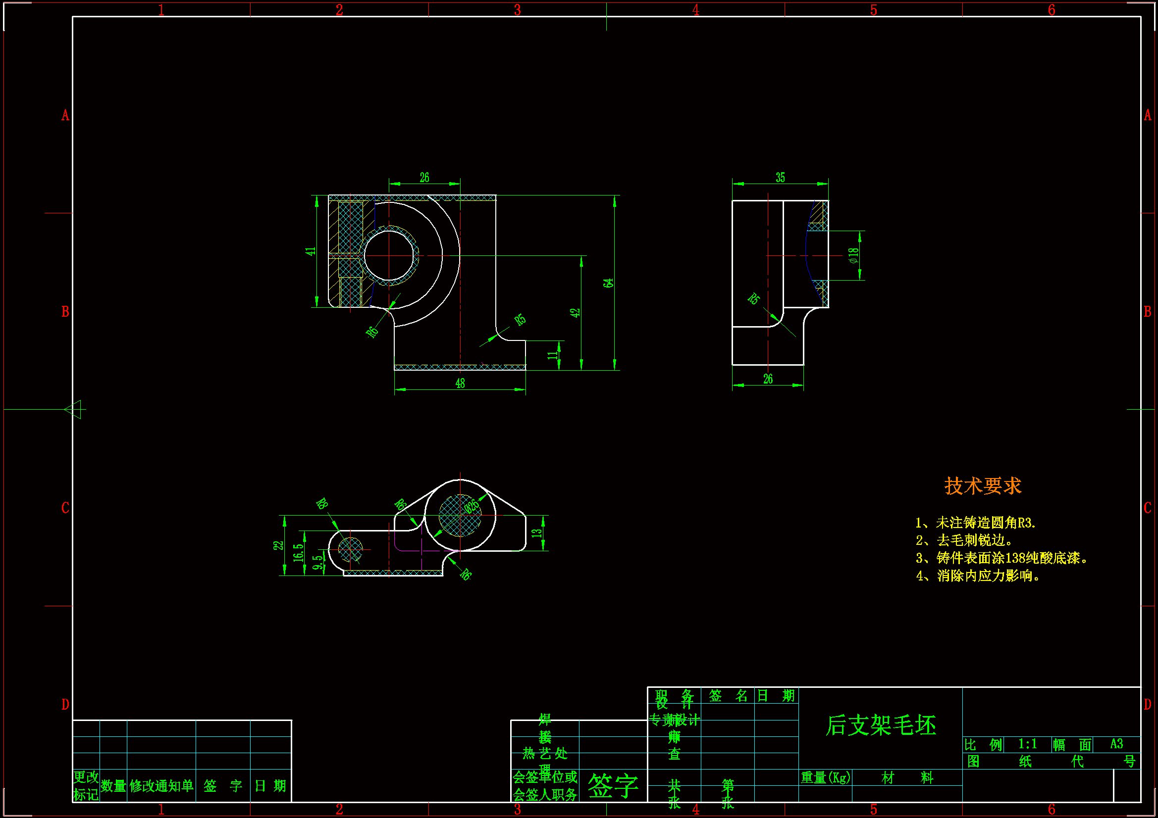 后支架的加工工艺和夹具设计包括三个部分,包括工艺设计、工序设计和专用夹具设计。在设计的过程中应该首先理解的分析部分,工序过程的设计一个毛坯的结构,并选择好零件的加工基准,设计出零件的工艺路线;然后每个切削用量的部分步骤大小计算,是决定工艺的关键设备和切割过程的各种设计参数,然后一个专用夹具,夹具选择各种组件的设计,如定位和夹紧元件连接部分,导向元件,夹具和机床和其他组件,定位误差计算夹具,分析夹具结构的合理性和不足之处,改进和设计。