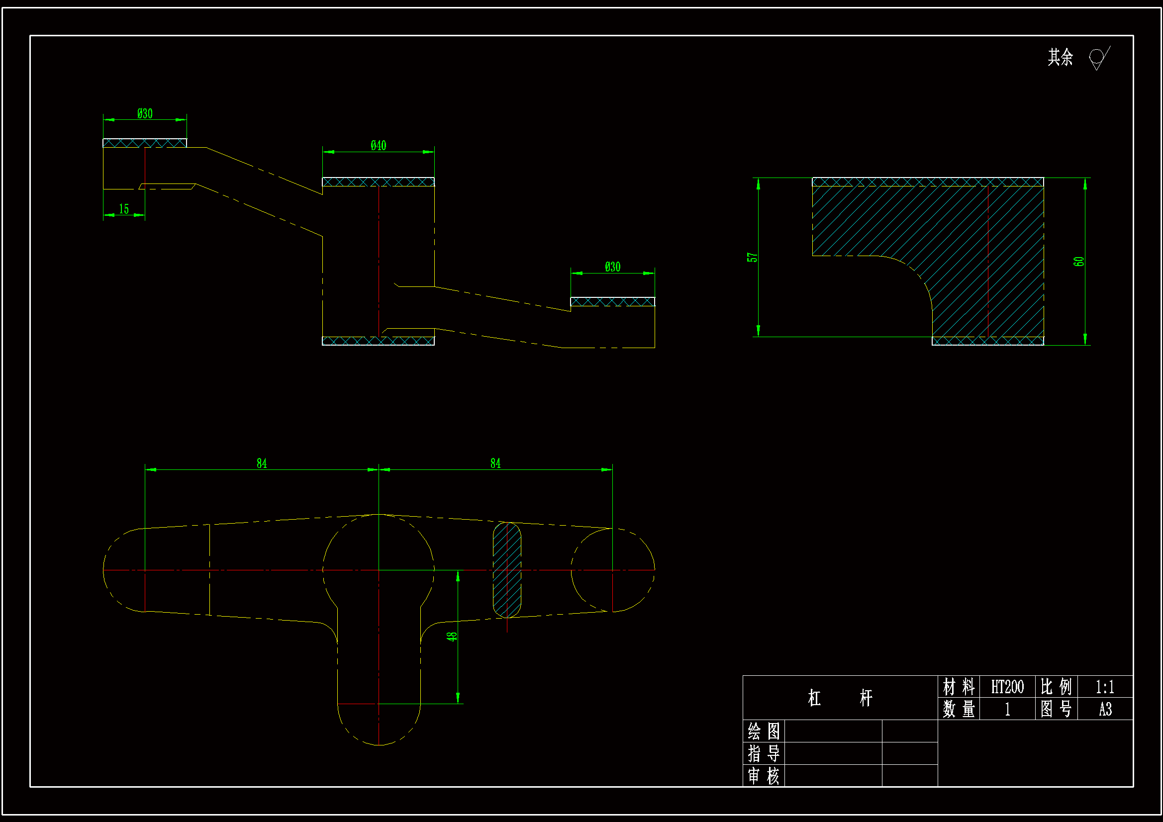 杠杆加工工艺规程及夹具设计是包括零件加工的工艺设计、工序设计以及专用夹具的设计三部分。在工艺设计中要首先对零件进行分析,了解零件的工艺再设计出毛坯的结构,并选择好零件的加工基准,设计出零件的工艺路线;接着对零件各个工步的工序进行尺寸计算,关键是决定出各个工序的工艺装备及切削用量;然后进行专用夹具的设计,选择设计出夹具的各个组成部件,如定位元件、夹紧元件、引导元件、夹具体与机床的连接部件以及其它部件;计算出夹具定位时产生的定位误差,分析夹具结构的合理性与不足之处,并在以后设计中注意改进。