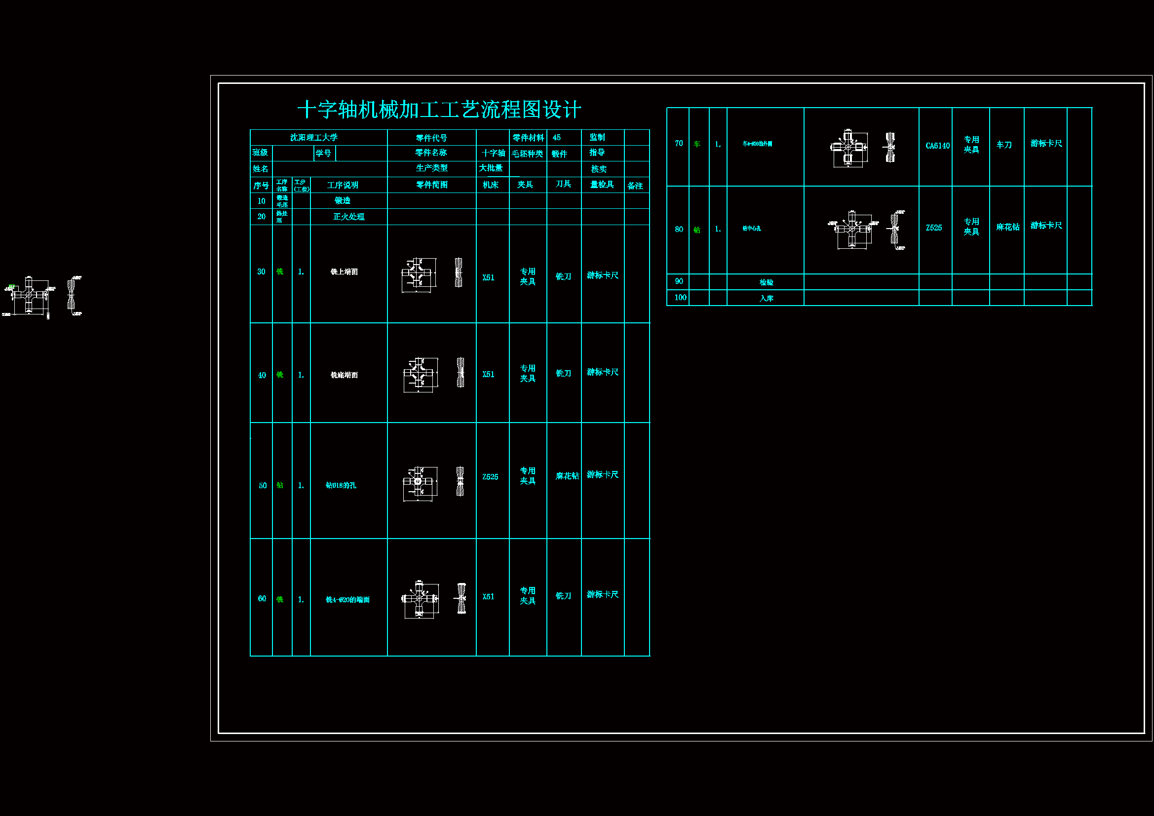 十字轴加工工艺规程及夹具设计是包括零件加工的工艺设计、工序设计以及专用夹具的设计三部分。在工艺设计中要首先对零件进行分析,了解零件的工艺再设计出毛坯的结构,并选择好零件的加工基准,设计出零件的工艺路线;接着对零件各个工步的工序进行尺寸计算,关键是决定出各个工序的工艺装备及切削用量;然后进行专用夹具的设计,选择设计出夹具的各个组成部件,如定位元件、夹紧元件、引导元件、夹具体与机床的连接部件以及其它部件;计算出夹具定位时产生的定位误差,分析夹具结构的合理性与不足之处,并在以后设计中注意改进。