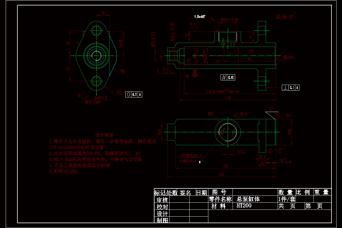 总泵缸体加工工艺规程及钻2-Φ10.5孔的夹具设计是包括零件加工的工艺设计、工序设计以及专用夹具的设计三部分。在工艺设计中要首先对零件进行分析,了解零件的工艺再设计出毛坯的结构,并选择好零件的加工基准,设计出零件的工艺路线;接着对零件各个工步的工序进行尺寸计算,关键是决定出各个工序的工艺装备及切削用量;然后进行专用夹具的设计,选择设计出夹具的各个组成部件,如定位元件、夹紧元件、引导元件、夹具体与机床的连接部件以及其它部件;计算出夹具定位时产生的定位误差,分析夹具结构的合理性与不足之处,并在以后设计中注意改进。