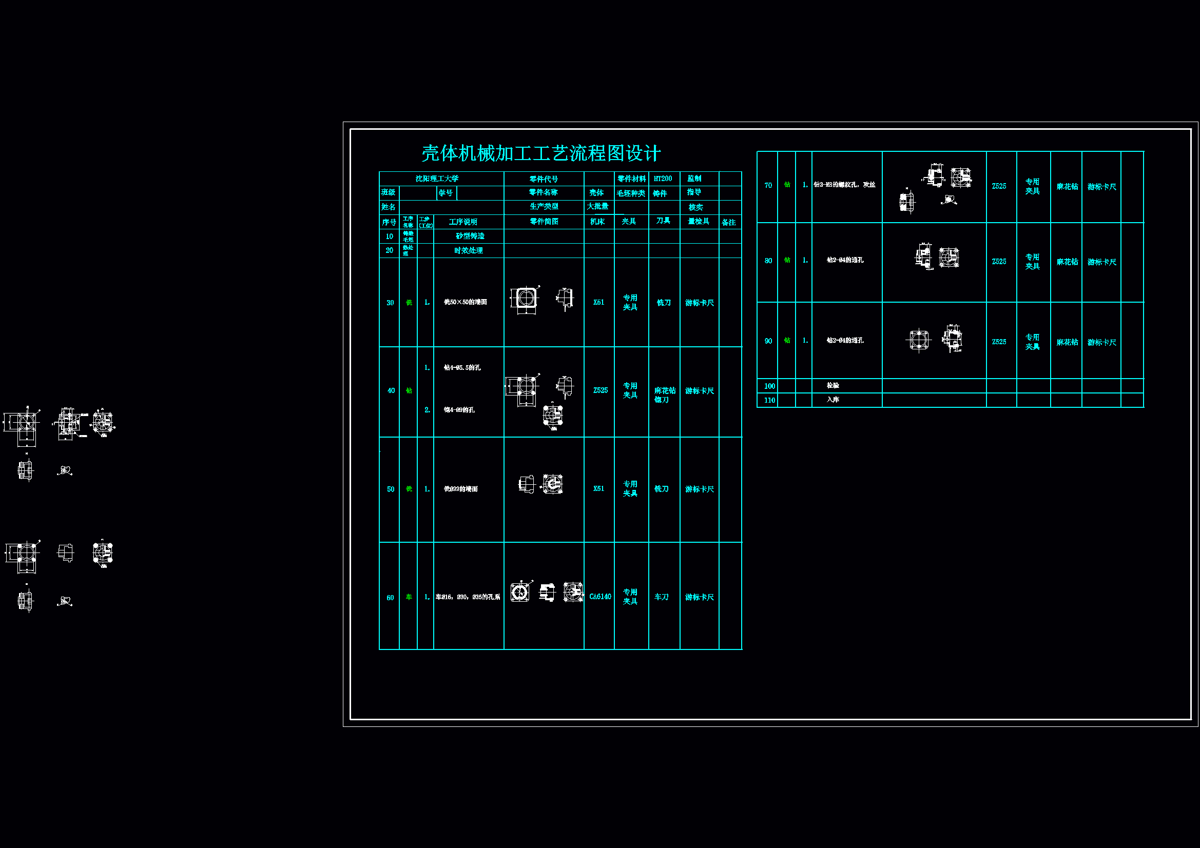 壳体加工工艺规程及钻孔的夹具设计是包括零件加工的工艺设计、工序设计以及专用夹具的设计三部分。在工艺设计中要首先对零件进行分析,了解零件的工艺再设计出毛坯的结构,并选择好零件的加工基准,设计出零件的工艺路线;接着对零件各个工步的工序进行尺寸计算,关键是决定出各个工序的工艺装备及切削用量;然后进行专用夹具的设计,选择设计出夹具的各个组成部件,如定位元件、夹紧元件、引导元件、夹具体与机床的连接部件以及其它部件;计算出夹具定位时产生的定位误差,分析夹具结构的合理性与不足之处,并在以后设计中注意改进。