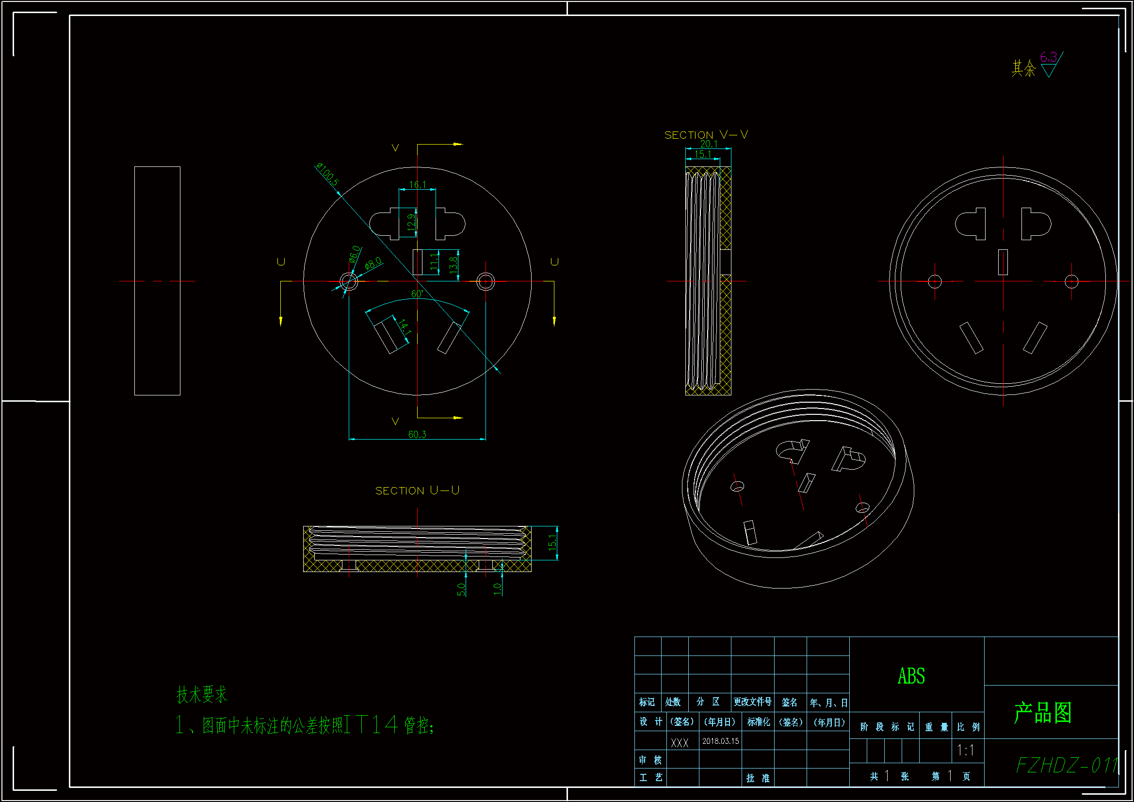 塑料是一种可塑性的合成高分子材料,具有重量轻且坚固,耐化学腐蚀,电绝缘性好,价格便宜,可塑性好等特点,广泛应用于电脑、手机、汽车、电机、电器、家电和通讯产品制造中。注塑成形是成形塑件的主要方法之一,是指使用注塑机将热塑性塑料熔体在高压下注入到模具内经冷却固化获得产品的方法。注塑的优点是生产速度快,效率高,操作可自动化,能成型形状复杂的零件,特别适合大量生产。本次设计的产品为五孔插销盖,具有重量轻,强度高,耐腐蚀,易清洁等特点,为大批量生产产品。本次设计在针对产品进行工艺性分析后,确定模具分型面、型腔数目、浇口形式、位置大小;其中最重要的是确定型芯和型腔的结构,以及它们的定位和紧固方式。此外还进行了脱模机构的设计,合模导向机构的设计,冷却系统的设计等。最后绘制完整的模具装配总图和主要的模具零件图及编制成型零部件的制造加工工艺过程卡片。实践证明:该模具结构合理、可靠,并能保证产品质量,对此类注塑产品的模具设计有参考价值。