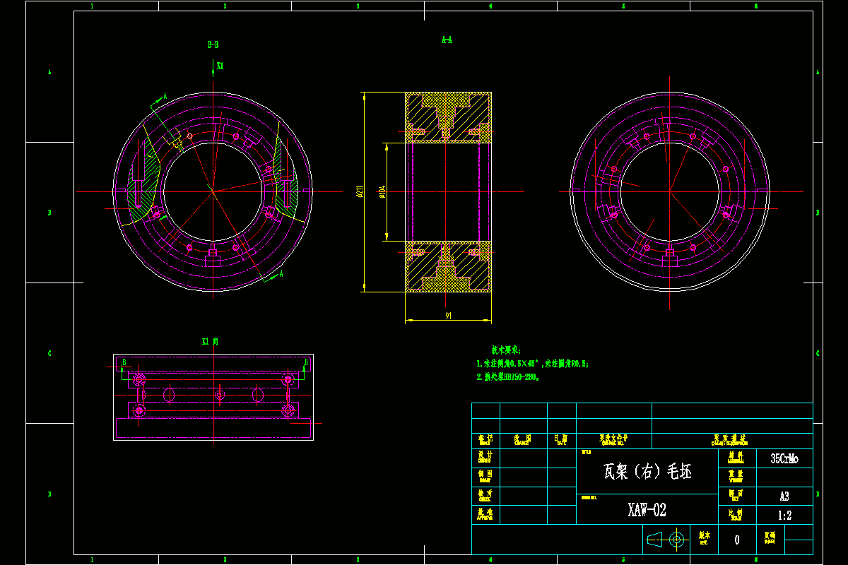 本设计是通过分析题目给的XAW_02-00瓦架(右)零件机构形式及加工形式,对加工的过程进行合理的路线设计和流程设计,然后再按要求设计一套专用夹具。在进行设计的时候大多的内容会包含机械加工能力、专用夹具设计、切削用量设计尺寸的公差与装配等知识点。瓦架零件的工艺规程设计就包括了零件加工过程设计、加工过程工艺参数技术以及零件专用夹具的设计这几个方向。最开始就要先分析零件特征,然后设计一套加工规程来生产零件,根据零件尺寸特点设计毛坯结构,进行加工标准分析,确定工艺加工路线。再后来对加工的每个工序的参数和尺寸进行计算,确定每个工序所用的设备及设备的参数设定。最后选择一道工序进行专用夹具设计,对夹具的整体部件进行设计,选择定位和夹紧的元件,设计导向装置和导向元件,同时还要考虑到设计的夹具怎么样与机床安装到一起。对夹具开始设计的时候还要分析零件完成定位时的误差大小,要进行计算和调整,对设计的夹具进行不足之处分析和整齐程度,再以后再设计相关夹具的时候记得改正。