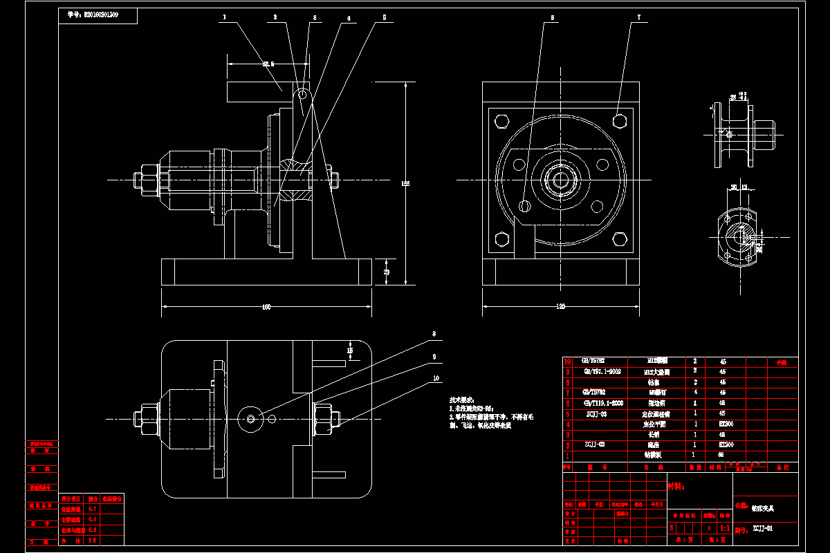 课程设计中我们针对法兰盘零件制定了两种加工工艺路线,并对其进行了计算得出选择一种最优的方案。对于夹具设计部分我们也制定了两套整体方案及定位方案,通过比较选择最合理的方案,并最终用CAD画出其装配图和夹具零件图。