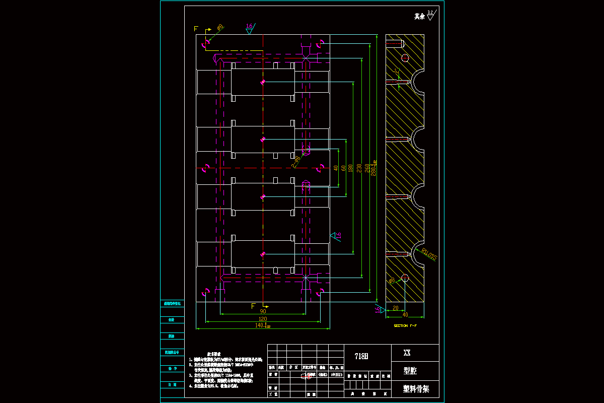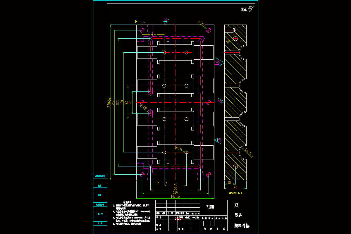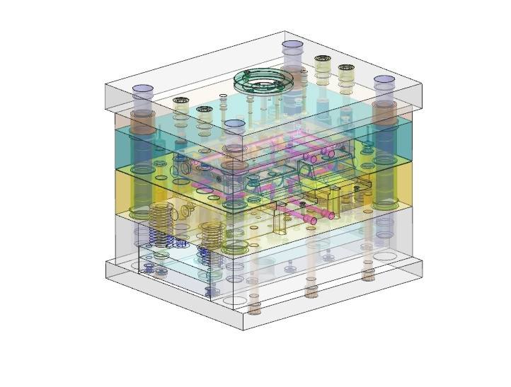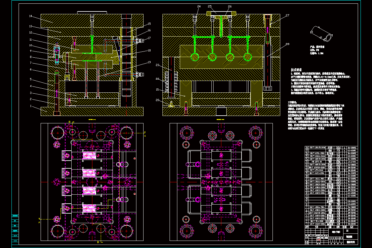 关键词:骨架;一模四腔;点浇口;滑块抽芯;注射机;冷却系统;注塑模具