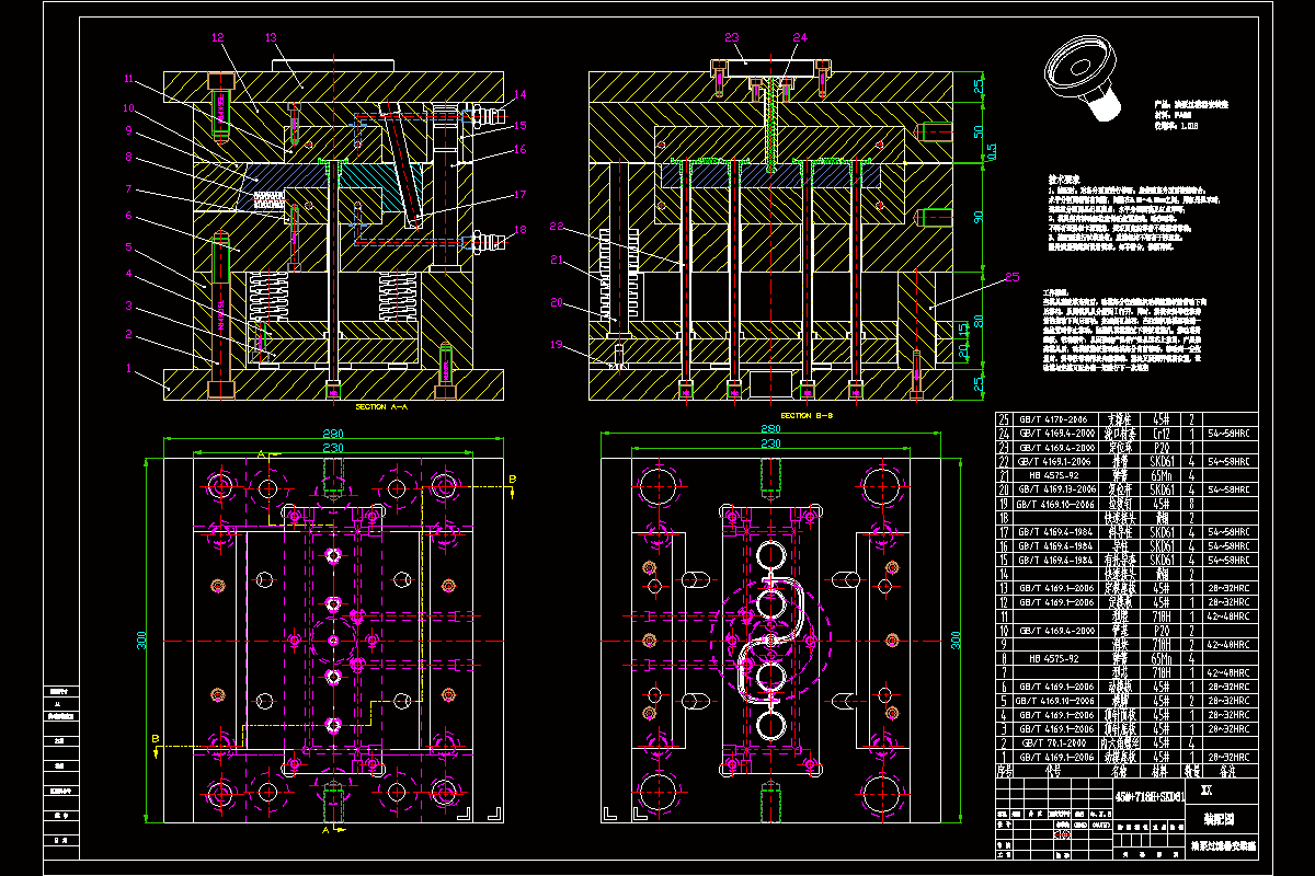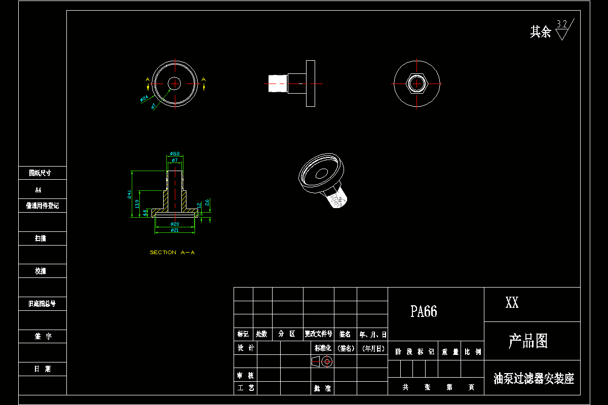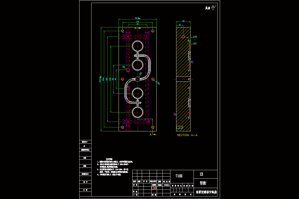 按照油泵过滤器安装座加工产品的需要,对于产品有什么用,对塑料产品的加工工艺进行分析等等,将塑料产品的大小定下来。这个模具的结构是一个模具四个腔室,选择使用滑块抽芯机构,进料口用的是侧浇口,注射机的型号是海天80XB型号,对冷却系统进行安排,画图纸的时候用绘图软件来画,生产模具的办法必须要合理。将说明书附在后面,将图纸也放在上面,将数据算出来,这样注塑模也就设计好了。