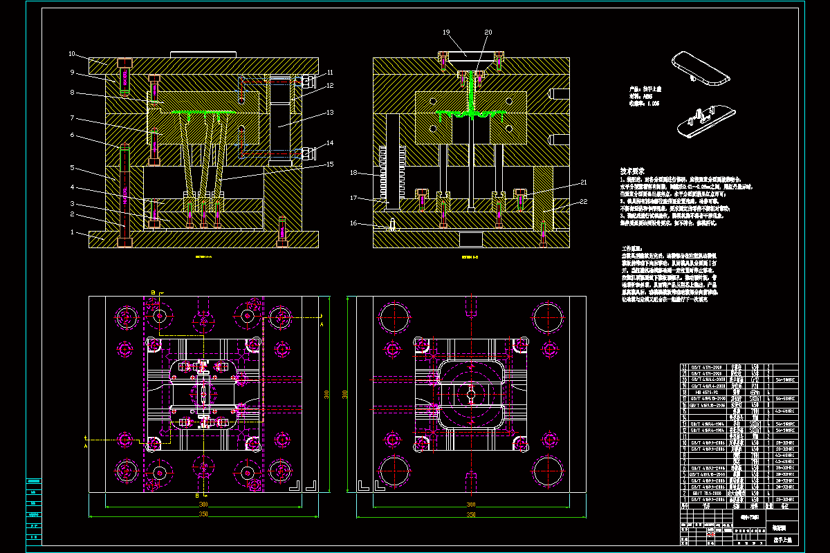 本次设计要注意塑件的设计要求,采用的材料和特性,注射的条件,塑件的尺寸精度、表面质量及几何形状,要明确塑件的生产批量及体积质量,该产品采用牛角型潜伏式浇口。从模具的角度考虑,要想降低成本,一定要注意注射机的选择及安装,需设计脱模机构。因此可设计成多腔模形式以提高生产率。所以本产品采用了一模出两件的形式进行成型加工,大大提高了生产效率。