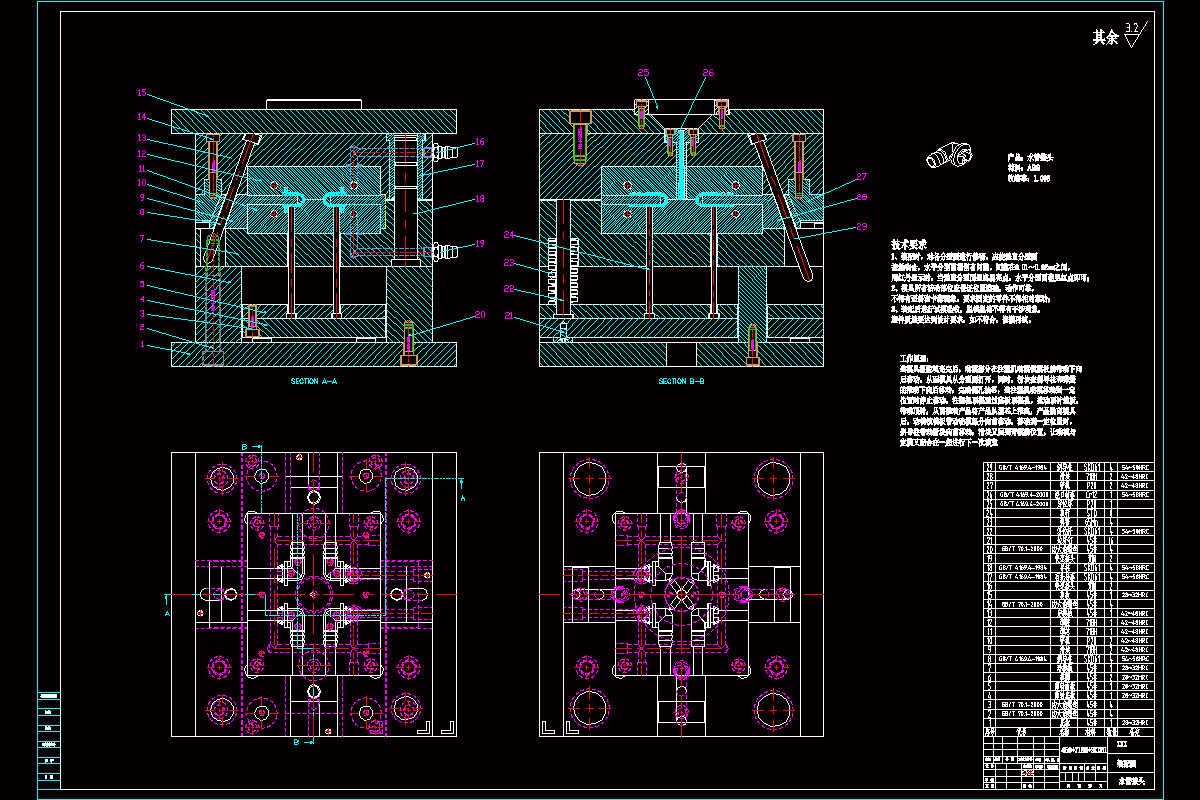 按照塑料水管接头加工产品的实际需要,对塑料产品拿到干什么的要了解清楚,对塑料产品的工艺进行分析,对塑料产品的大小精度要求进行分析,注意塑料产品的大小要求是多少。这个模具的构造是一个模具四个腔室,进料的时候用的是侧浇口,注射机的型号是HT80W1×B型号,需要冷却部分,在绘制图纸的时候用的是CAD软件还有UG软件,确定下来比较合理的加工方式。将说明书也写好,用简单的文字进行说明,将图纸也附在里面,将相关的数据算出来,这样设计的注塑模具就合理了。