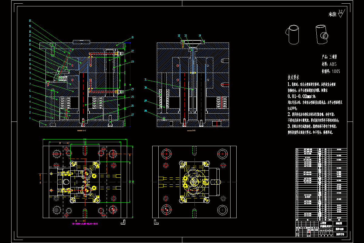 关键词:直角三通管接头;一模两腔;侧浇口;注射机;冷却系统;注塑模具