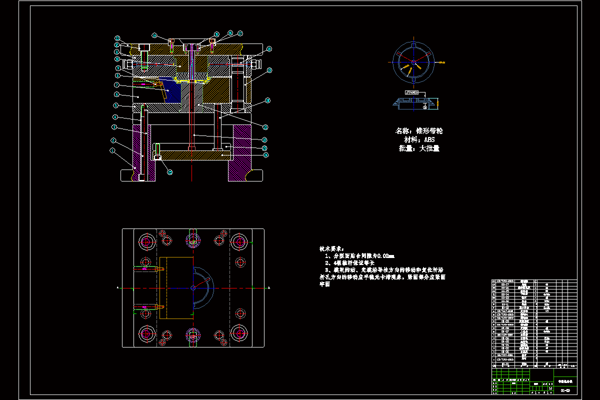 模具工业是国民经济的基础工业,被称为“工业之母”。而塑料模具又是整个模具行业中的一枝独秀,发展极为迅速。塑料制件之所以能够在工业生产中得到广泛应用,是由于它们本身具有的一系列特殊优点所决定的。人类社会的进步与材料的使用密切相关。人类要生存,要发展就离不开材料的使用。塑料是20世纪才发展起来的一类材料。塑料是一种可塑性的合成高分子材料,具有重量轻且坚固,耐化学腐蚀,电绝缘性好,价格便宜,可塑性好等特点,广泛应用于电脑、手机、汽车、电机、电器、家电和通讯产品制造中。注塑成形是成形塑件的主要方法之一,是指使用注塑机将热塑性塑料熔体在高压下注入到模具内经冷却固化获得产品的方法。注塑的优点是生产速度快,效率高,操作可自动化,能成型形状复杂的零件,特别适合大量生产。本次设计的产品为锥形带轮,具有重量轻,强度高,耐腐蚀等特点,为大批量生产产品。本次设计在针对产品进行工艺性分析后,确定模具分型面、型腔数目、浇口形式、位置大小;其中最重要的是确定型芯和型腔的结构,以及它们的定位和紧固方式。此外还进行了脱模机构的设计,合模导向机构的设计,冷却系统的设计等。最后绘制完整的模具装配总图和主要的模具零件图及编制成型零部件的制造加工工艺过程卡片。实践证明:该模具结构合理、可靠,并能保证产品质量,对此类注塑产品的模具设计有参考价值。