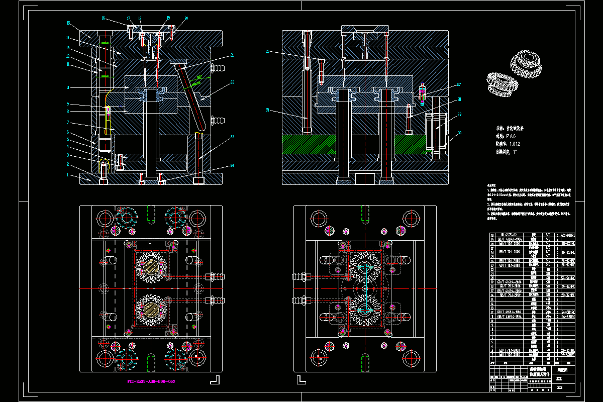 本次是齿轮链轮套塑件的注塑模设计,选用的材料为PA塑料。此次模具的制作使用一模二腔,模具制作时进料使用侧浇的方法,之后根据各项参数,选用适合的注射机,根据具体的各项参数设置浇注系统、冷却系统、成型零件、排气结构、脱模结构。最后使用Auto CAD作图,同时用CREO绘制3D图辅助设计。