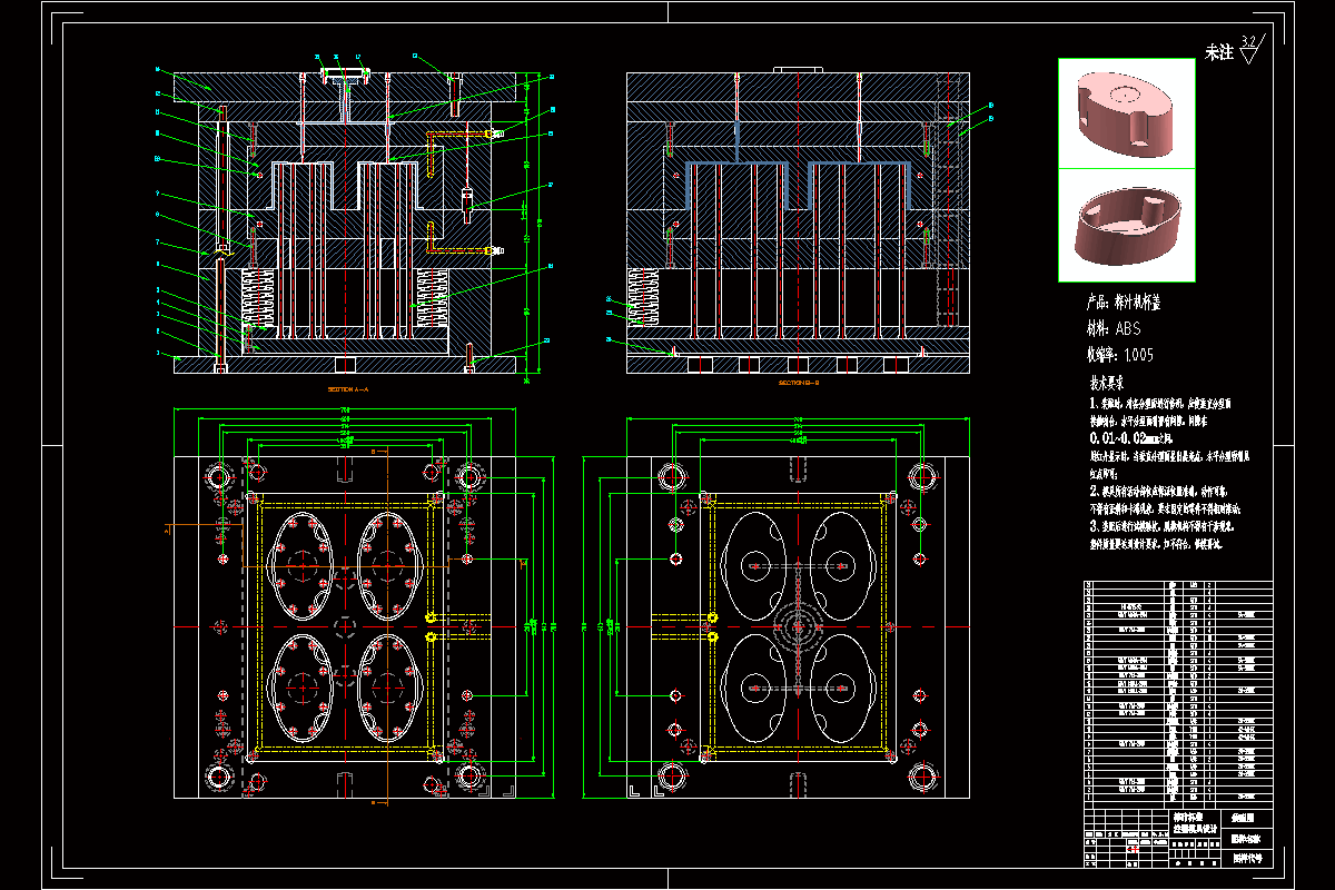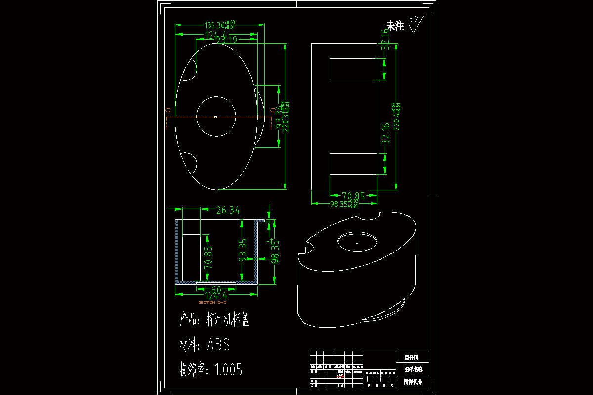 关键词:榨汁杯盖;一模二腔;侧浇口进料;注射机;注塑模具