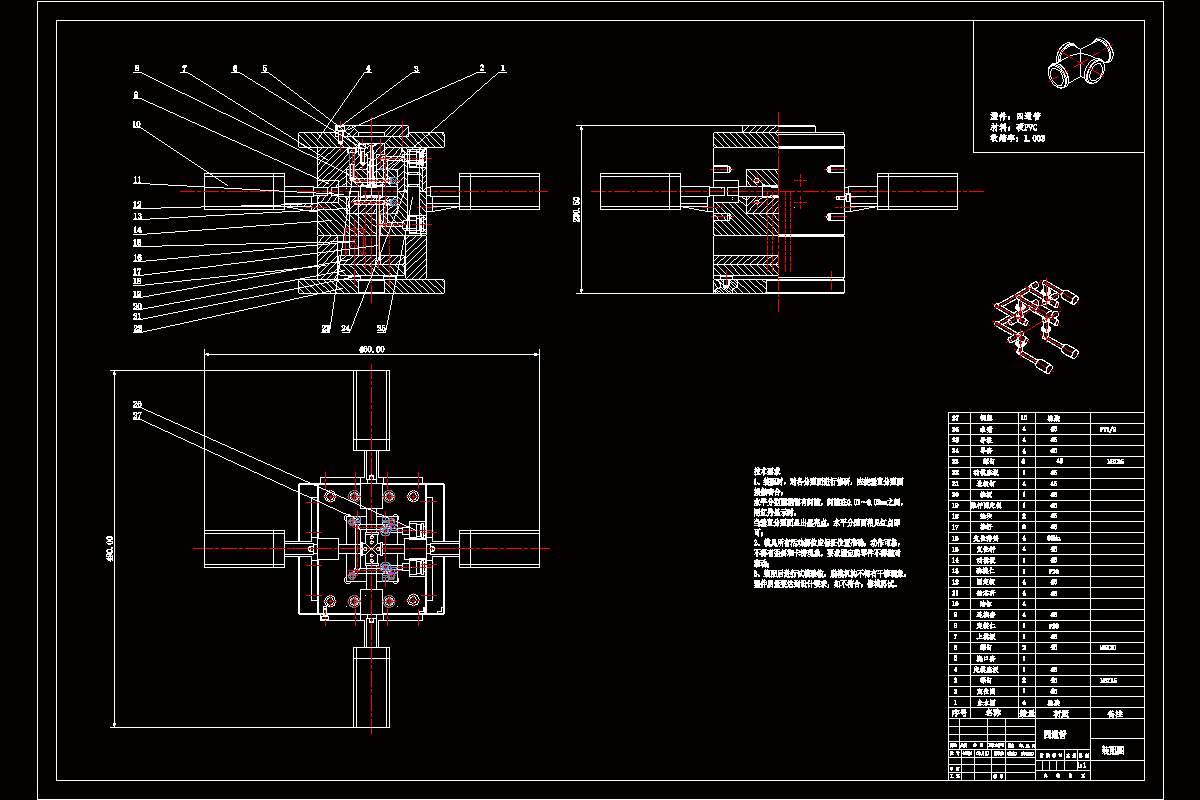 关键词:四通管;一模一腔;直浇口进料;注射机;冷却系统;注塑模具