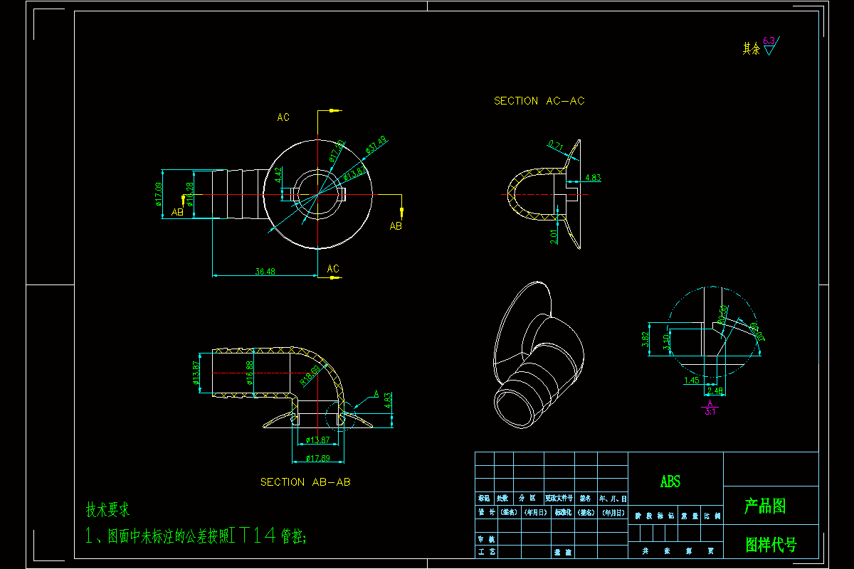 塑料是以高聚物为主要成分的物质,它的特点是重量轻,比较坚固,耐化学腐蚀性和电绝缘性优良,市场上塑料价格相对便宜,具有不错的可塑性,在电脑、手机、汽车、医疗器械、电器、家电和通讯产品制造中有着广泛的应用。通常塑件是用塑料熔体注射进注射模具的行腔中形成的。注射模具有很多优点,比如成型效率高、生产出的塑件一致性好,可以自动化操作,可以大量生产复杂零件,加工成本不高。本次设计的产品为弯管接头,它的特点是重量轻,强度高,耐腐蚀,易清洁,适合大批量生产。要完成本次设计,首先要先分析塑件的工业特点,然后确定其注射成型原理,选择合适的注射机和模架。然后要确定模具的分型面、型腔数目、流道结构、浇口形式和位置。接着要确定塑件在模具中的位置,从而才能选择模具内部零件结构,和塑件的固定形式。然后根据这些设计模具的脱模、推出等机构。最后要完成一份模具设计的装配图、三维图和一份设计报告。