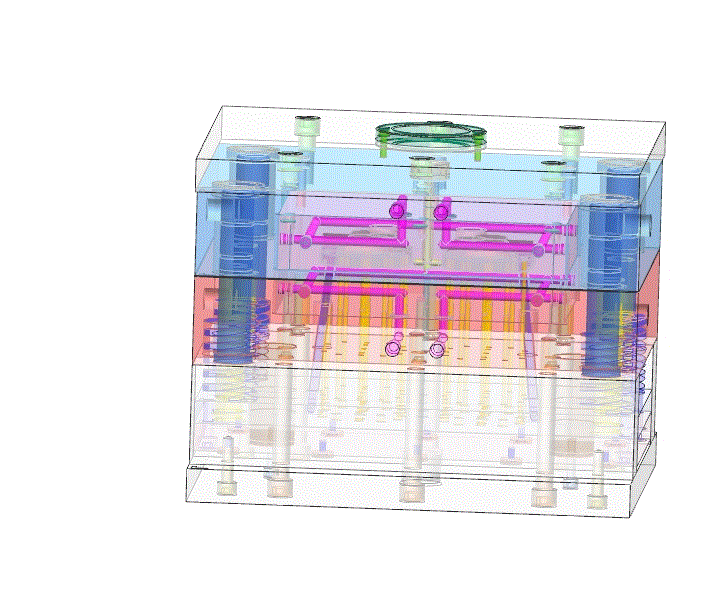 产品的3D建模,借助三维软件设计软件创建型腔、活块以及其他零件,并自动生成所需要的零件工程图;使用草图和厚度检测,评估零件;对于模架的设计,利用三维软件模座专家胡波来完成,从标准模架选择到产品输出,全部采用3D化设计。我在小家电外壳模具设计过程中,从零件建模到型腔、型芯的设计、模架设计,直至最后的模具开模动作模拟都充分发挥了三维软件设计软件的各个模块和插件的优势,基本做到了无图纸化设计。采用一模两腔的设计。注塑机综合注塑容量、锁模力、最大注塑面积和模内压力等技术参数确定注塑机型号选用海天160X2B。模座选用龙记,其他标准件选用Misumi。使用了模具设计软件——三维软件,从最初的零件3D建模到最后的模具各部分零件的装配,模座设计,工程图文件,依靠三维软件的各个模块,得到合乎设计规范的工程图。
