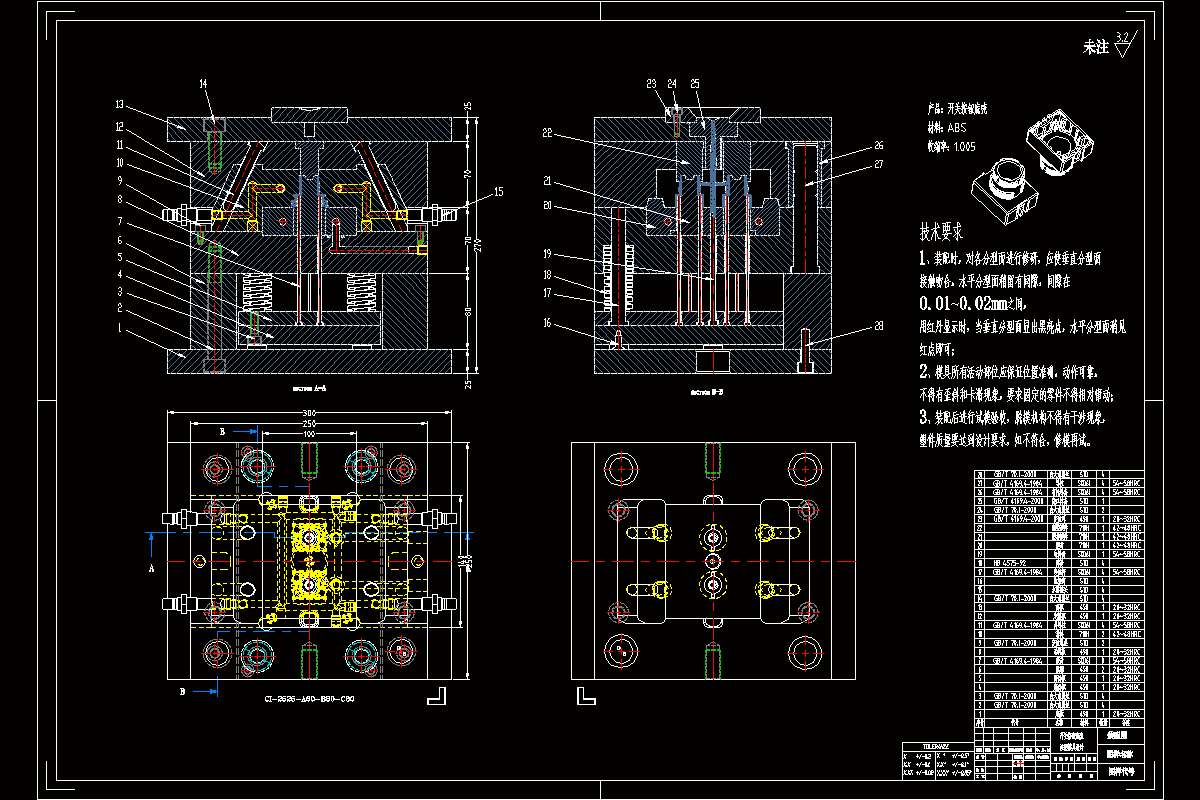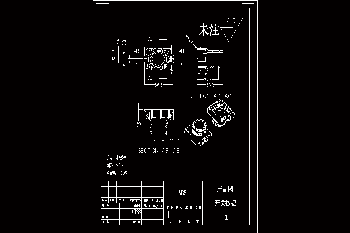 关键词:开关按钮底壳;一模二腔;侧浇口进料;注射机;注塑模具