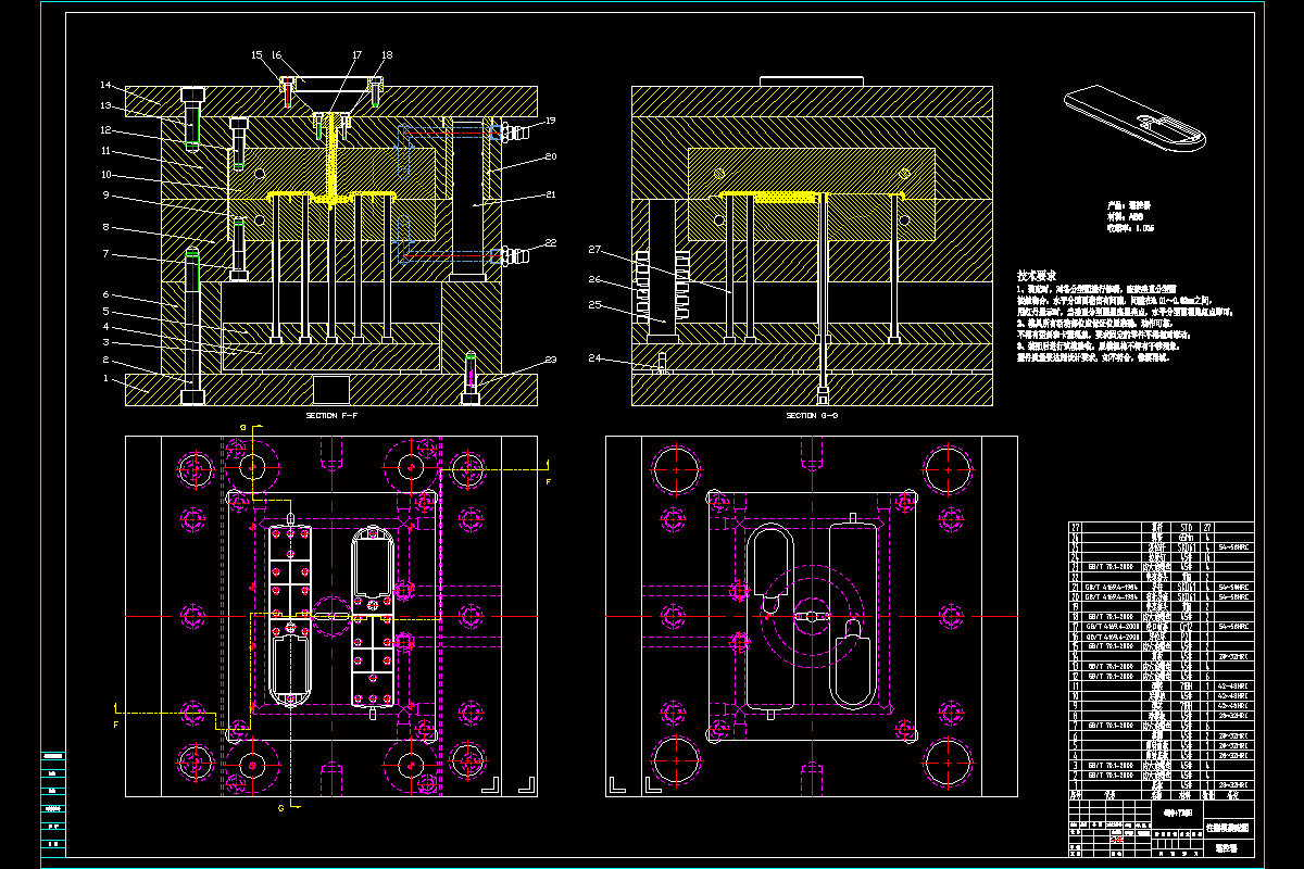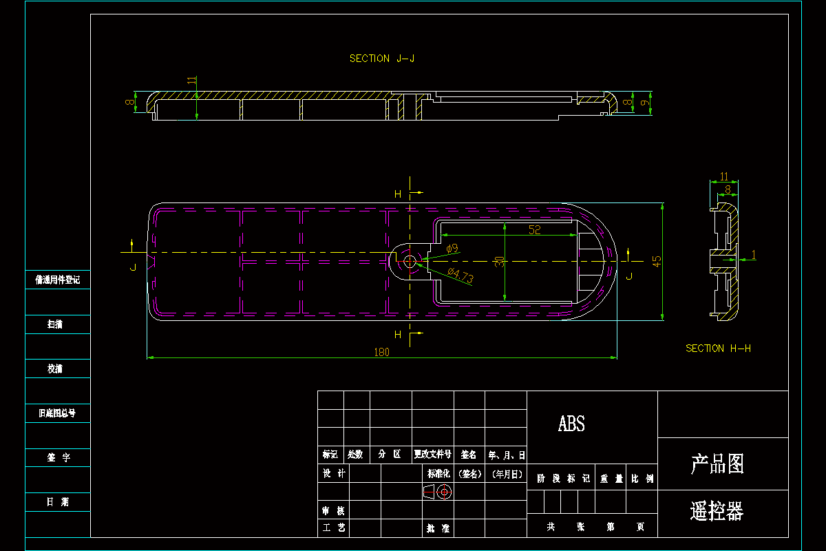 关键词:电视机遥控器后盖,一模两腔,侧浇口进料;注射机,冷却系统,注塑模具