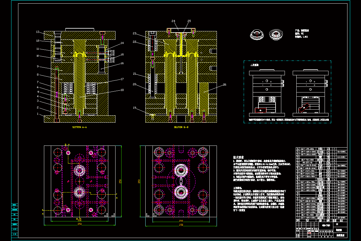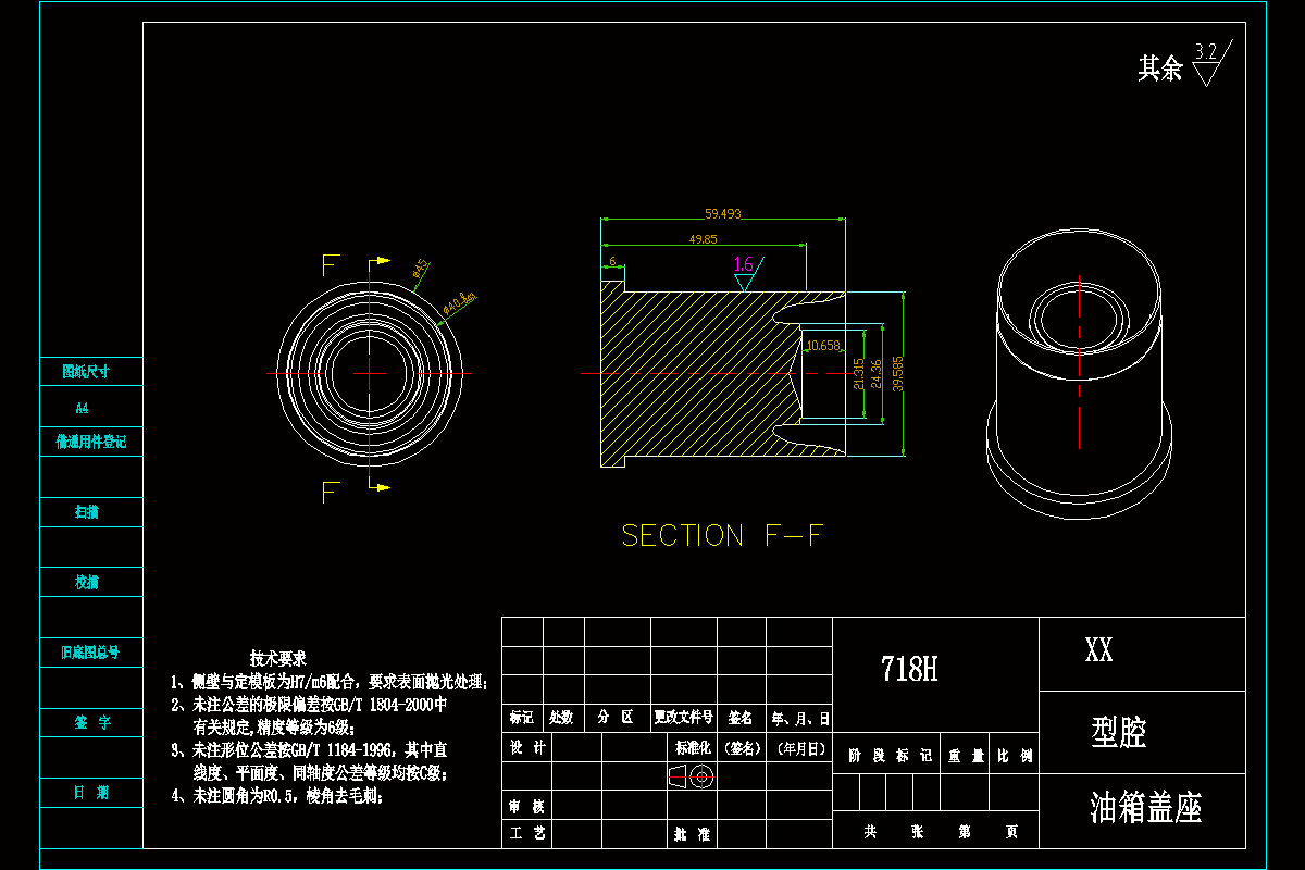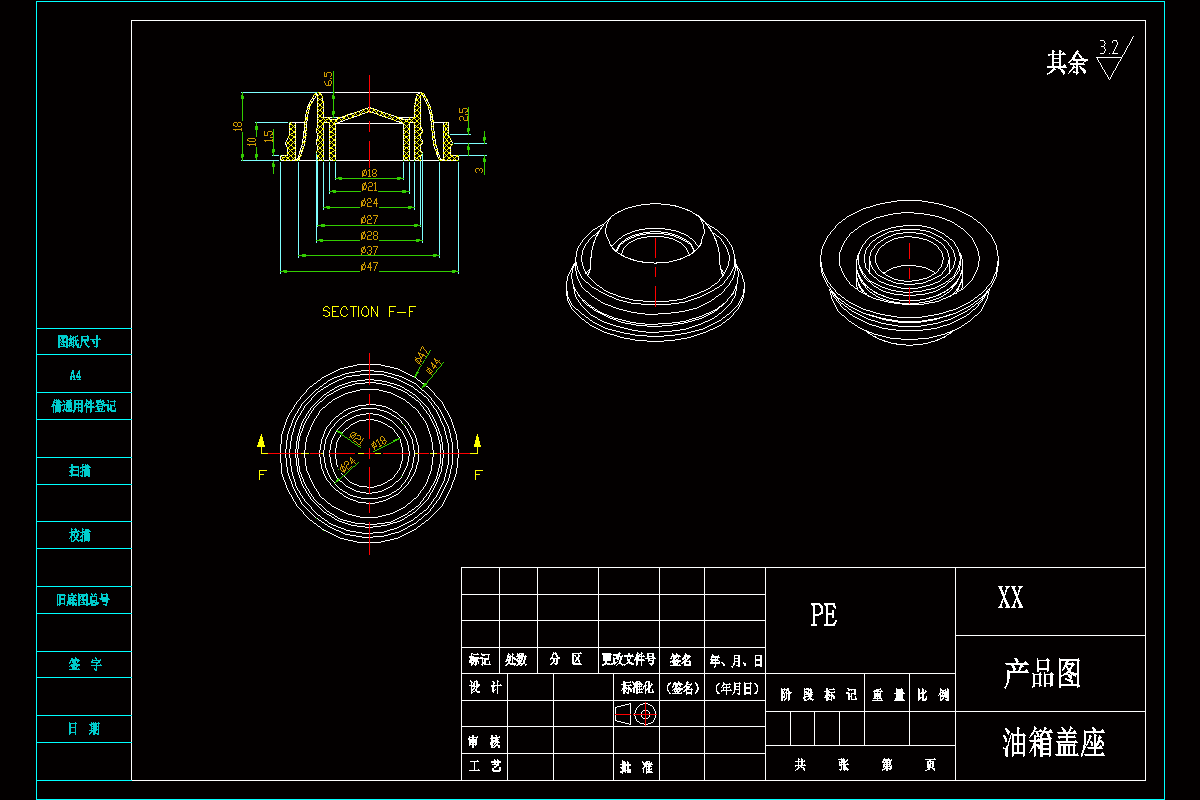 关键词:油箱盖座;一模两腔;侧浇口进料;注射机;冷却系统,注塑模具。