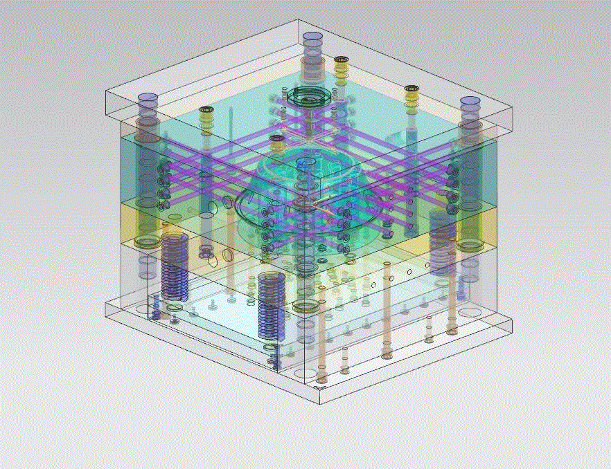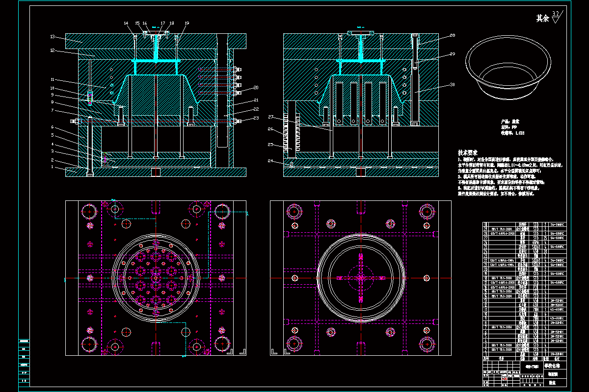 权衡了塑件的外形尺寸。里面的模具结构是一个模具一个腔室,在模具的点边的面上安置的进料口,在模具里面的注射剂使用的型号是HTF1250X2B,这个模具是具备冷却功能的。加工的顺序合理的安排,将总装配图纸还有零件图都用电脑的绘图软件画出来。