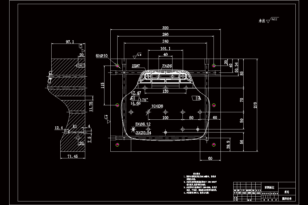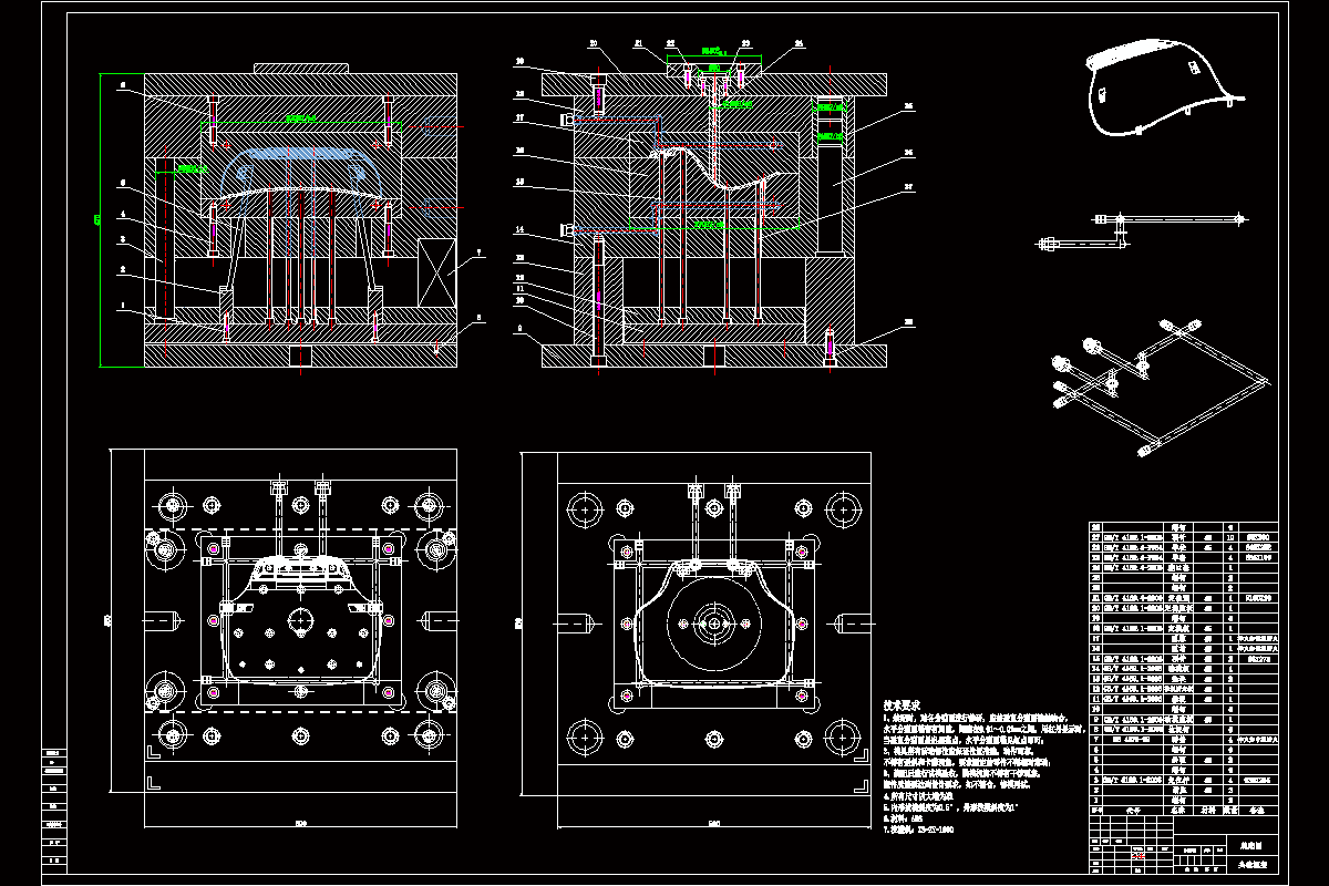 此说明书介绍了头枕框架塑件的模具设计,考虑到注射机的大小,模具采用一模一件的形式,直接浇口进料,注射机选用XS-ZY-1000,有合理的排气系统和冷却系统。在模具设计的过程中,采用了UG三维造型, AutoCAD绘制总装图及各成型零件图,并编制加工工艺卡等零件的机加工工艺。