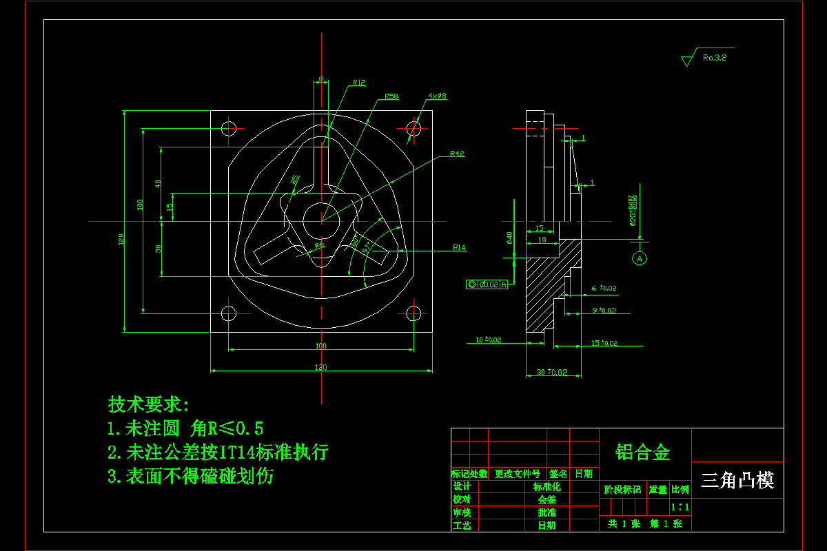 本课题以三角凸模为例,通过AutoCAD、Mastercam制图软件来设计,并用宇龙数控仿真系统对其进行模拟加工,体现出数控加工的优势。数控铣床加工该零件的一些准备工作如:加工前对零件进行整体的外型分析来选择最适合数控加工所使用的夹具;对所加工零件的加工工艺的安排:决定加工的顺序,再根据安排的工艺和零件的材料进行刀具选择和刀具的转速和进给速度的确定;最后根据安排的工艺和选择的刀具和夹具对零件进行程序的编写:根据零件的图形和尺寸确定所加工平面的工件坐标系选择适当刀具路径和去除残料的加工并详细列出编写的程序。
