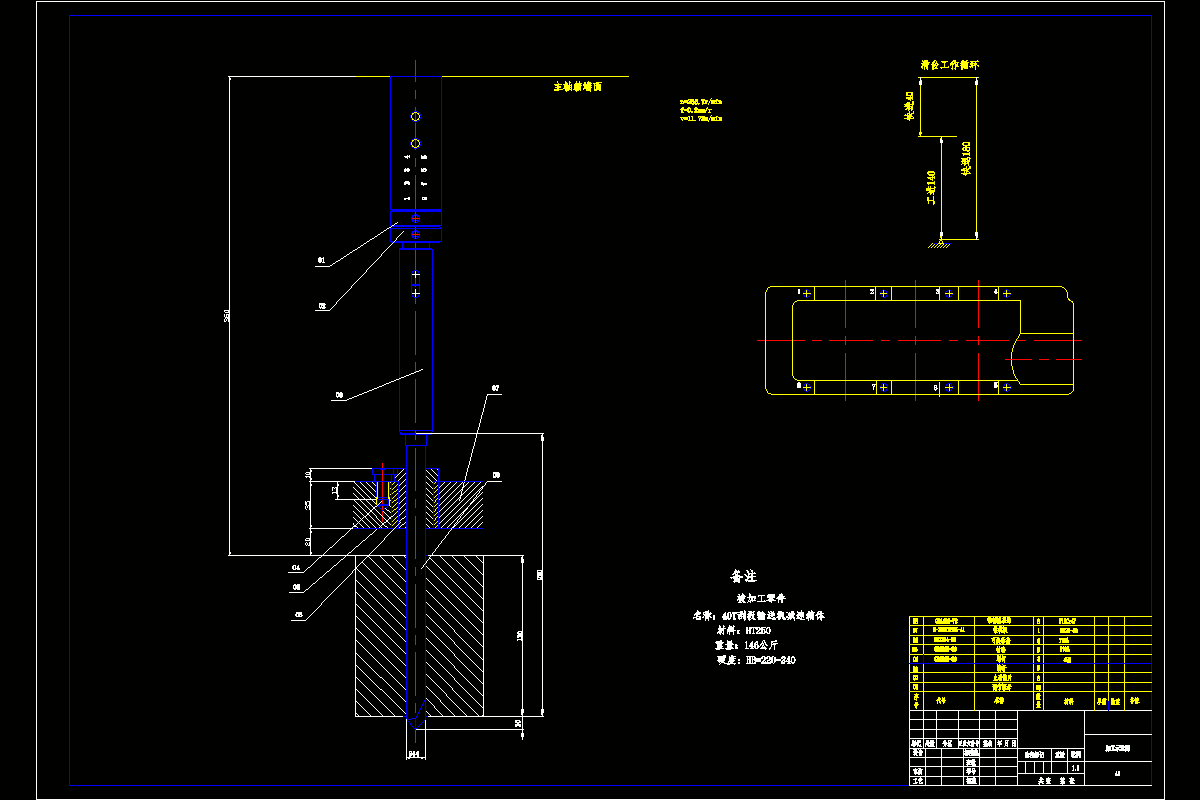 本设计说明书介绍了40T刮板输送机减速箱体加工工艺及立式钻孔组合机床主轴箱设计过程和主要参数。首先简明的介绍了组合机床的特点加工精度和其发展趋势以及40T刮板输送机减速箱体加工工艺和采用组合机床的经济性分析。其次对组合机床进行了设计,根据要求确定了钻40T刮板输送机减速箱体结合面的8个Φ14的孔的组合机床的形式及零部件选择,动力部件选择及参数确定,三图的绘制等。第三是组合机床主轴箱的设计,主轴的主要技术参数及零部件选择。及各轴和齿轮的确定以及各主轴的转速校核。