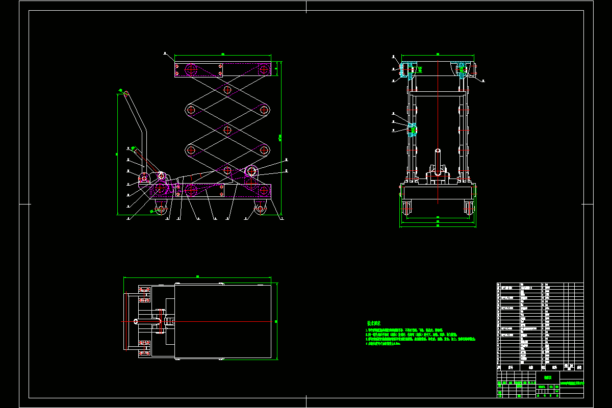 100KG手动液压升降平台的设计含proe三维及8张CAD图带设计计算说明。设计的液压升降平台是手动的,最开始将它的结构设计出来;之后对货品的具体大小进行调查,将货物的模型建立起来,这样升降平台的整体结构大小就都确定了;之后,将升降平台的力学模型建立起来,升降平台机构所处地点不一样,那么还要分析他们的受力,对杆件,销轴,螺栓的强度进行校核;之后设计升降平台液压系统,最后一步用CAD软件将升降平台的装配图,零件图都画出来,用Pro/e将三维模型建立起来。