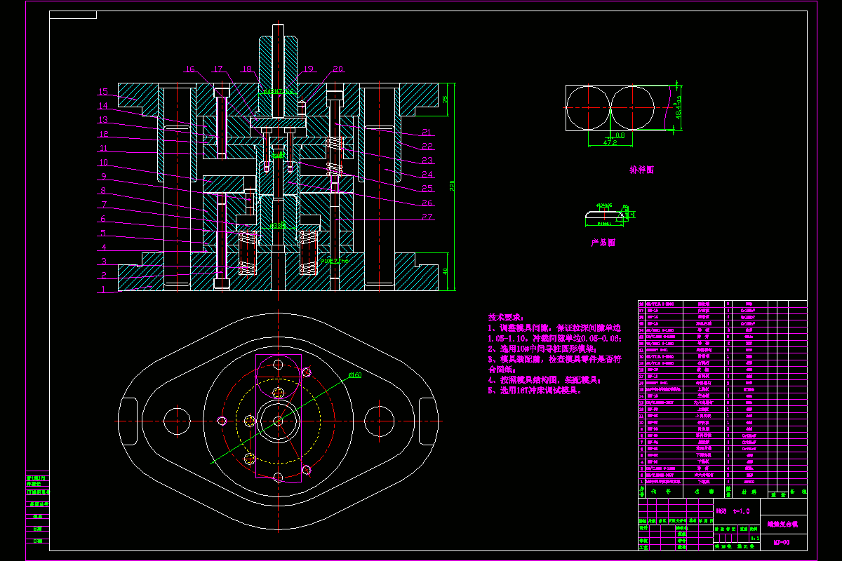 本设计是对给定的端盖产品图进行冲压模具设计。冲压工艺的选择是经查阅相关资料和和对产品形状仔细分析的基础上进行的;冲压模具的选择是在综合考虑了经济性、零件的冲压工艺性以及复杂程度等诸多因素的基础上进行的;产品毛坯展开尺寸的计算是在方便计算,但不影响模具成型的前提下,简化为所熟悉的模型进行的。文中还对冲压成型零件和其它相关零件的选择原则及选择方法进行了说明,另外还介绍了几种产品形状的毛坯展开尺寸计算的方法和简化模型,以及冲压模具设计所需要使用的几种参考书籍的查阅方法。
