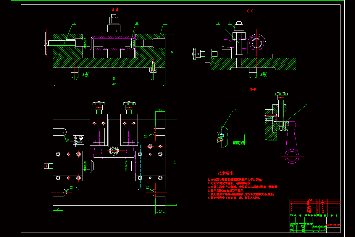 本设计是基于分离叉零件的加工工艺规程及一些工序的专用夹具设计。分离叉零件的主要加工表面是平面和孔系。一般来说,保证平面的加工精度要比保证加工精度容易。因此,本设计遵循先面后孔的原则。并将孔与平面的加工明确划分成粗加工和精加工阶段,以保证加工精度。在工艺设计中要首先对零件进行分析,了解零件的工艺再设计出毛坯的结构,并选择好零件的加工基准,设计出零件的工艺路线;接着对零件各个工序进行尺寸计算,关键是决定出各个工序的工艺装备及切削用量;然后进行专用夹具的设计,选择设计出夹具的各个组成部件,如定位元件、夹紧元件、引导元件、夹具体与机床的连接部件以及其它部件;计算出夹具定位时产生的定位误差,分析夹具结构的合理性与不足之处,并在以后设计中注意改进。