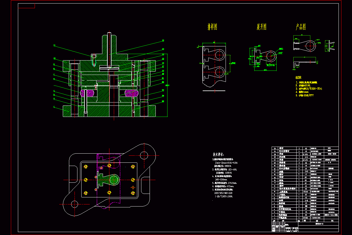 本设计对模具设计思路及结构特点进行了较全面论述。结合模具发展现状及冲压模具设计的主要技术,对拉紧片弯曲件进行了详细的工艺分析;进行了冲压力、压力中心以及模具工作部分尺寸等冲压工艺计算;并对卸料装置、定位装置及导料装置等模具结构样式进行了选择;根据计算结果以及模具结构,对模具的主要零部件进行了设计;以及对压力机进行了合理选择。