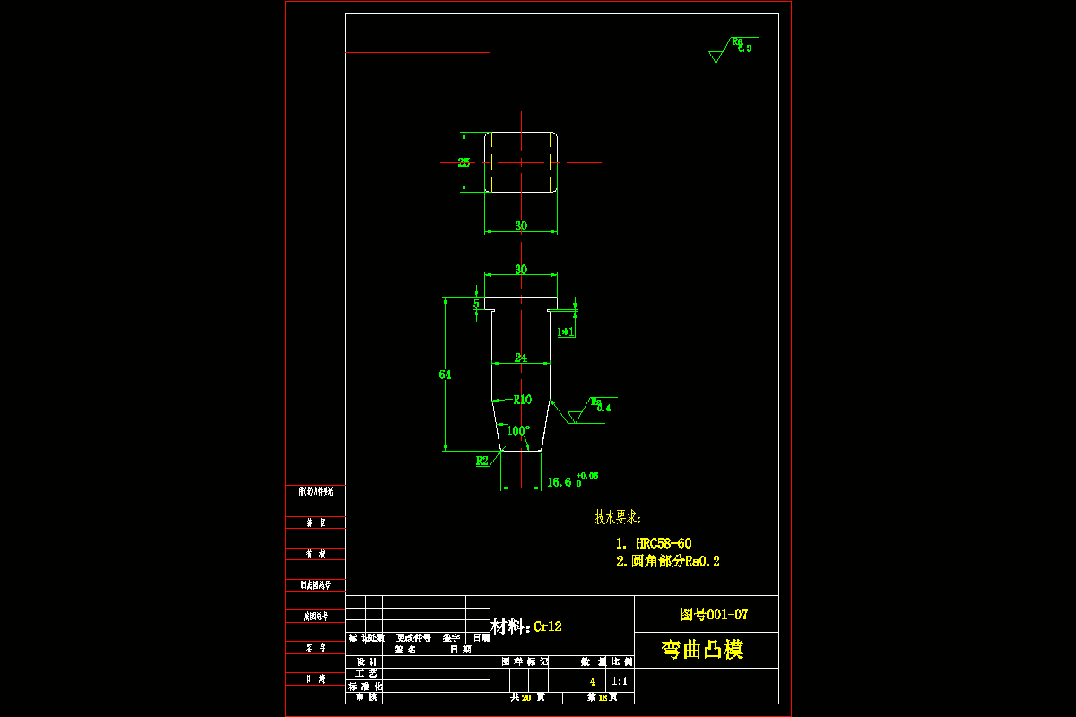 第二副模具为弯曲模,其对产品的定位为定位板,凸模在上,产品向上弯曲,角度为九十度。