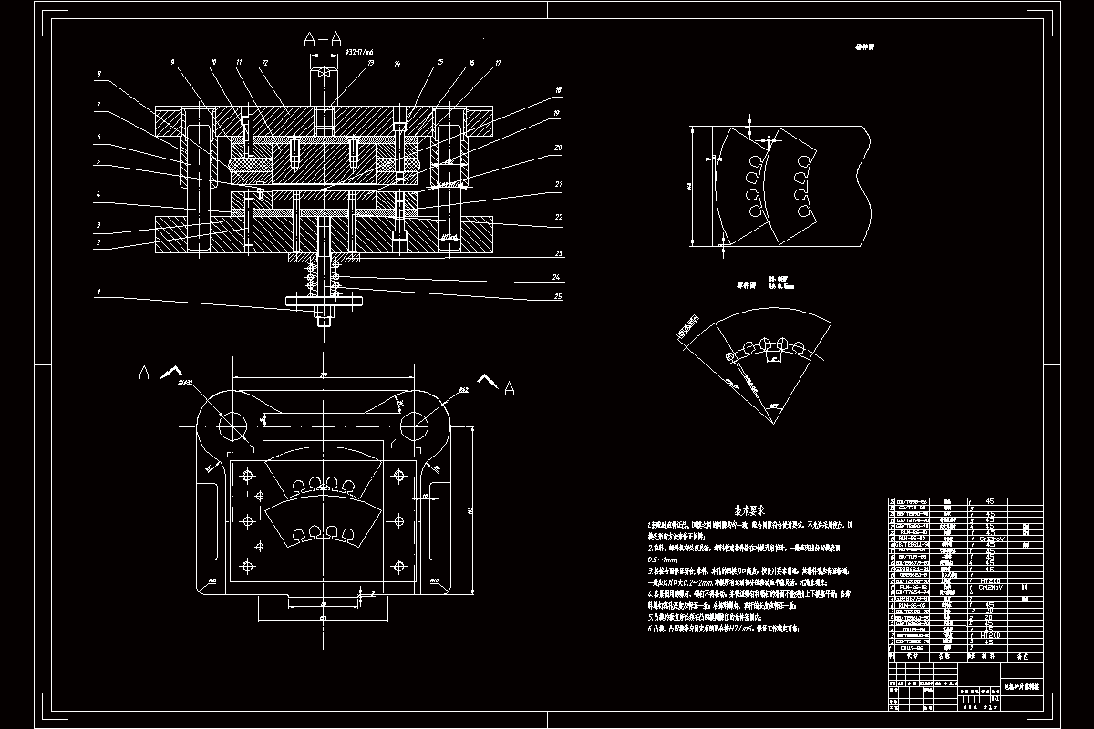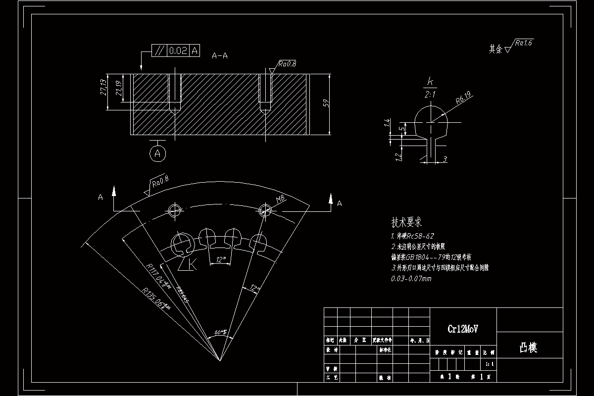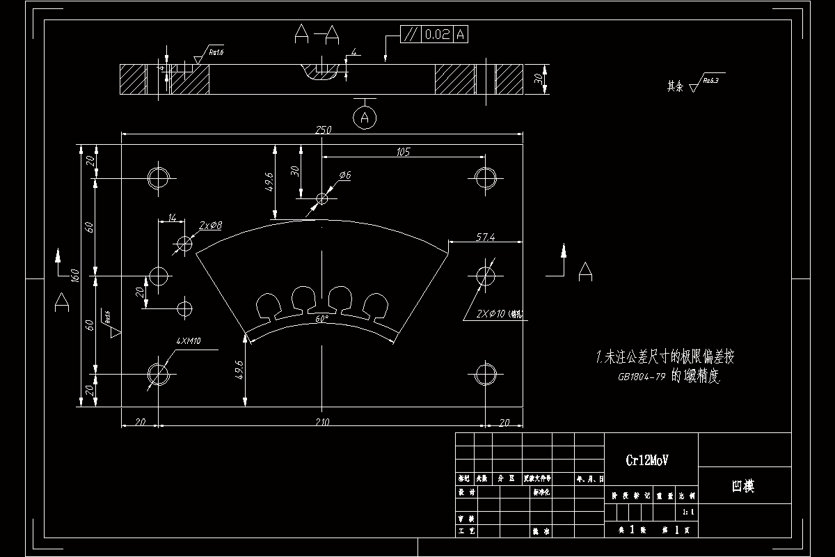 这次设计的题目是电机冲片工艺分析及模具设计。零件为电机冲片,材料为08F,因为该零件的结构简单且对称,要求的尺寸精度不高,所以采用单工序落料模,板料在一个位置完成落料,即可冲压出所需的外形,提高了工作效率。并且还保证了零件的各项尺寸精度要求。