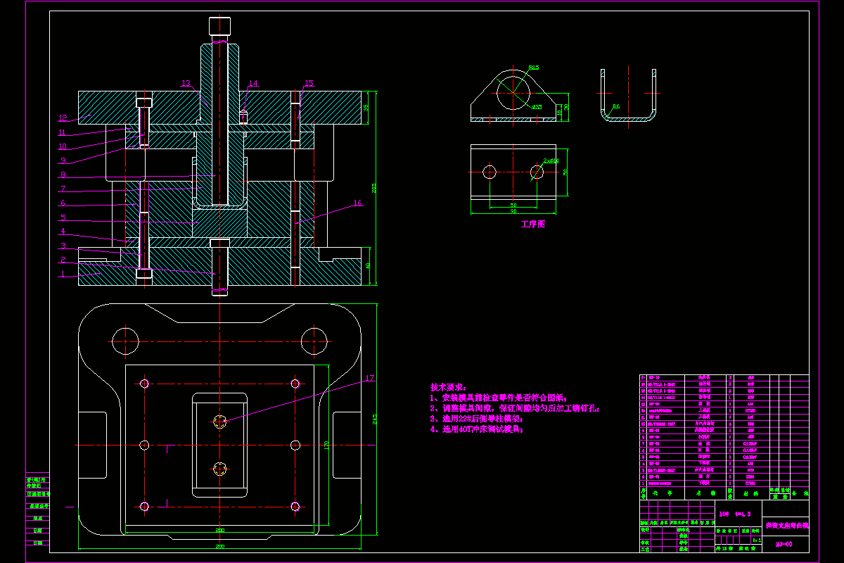 本设计是对给定的弹簧支座产品图进行冲压模具设计。冲压工艺的选择是经查阅相关资料和和对产品形状仔细分析的基础上进行的;冲压模具的选择是在综合考虑了经济性、零件的冲压工艺性以及复杂程度等诸多因素的基础上进行的;产品毛坯展开尺寸的计算是在方便建设又不影响模具成型的前提下简化为所熟悉的模型进行的。文中还对冲压成型零件和其它相关零件的选择原则及选择方法进行了说明,另外还介绍了几种产品形状的毛坯展开尺寸计算的方法和简化模型,以及冲压模具设计所需要使用的几种参考书籍的查阅方法。