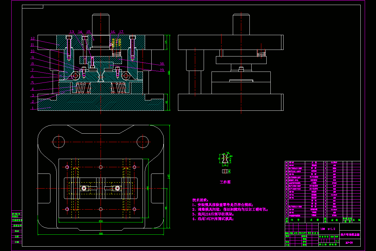 本设计是对给定的包覆机加热箱加热管座产品图进行冲压模具设计,此次设计选择复合模结构完成。冲压工艺的选择是经查阅相关资料和和对产品形状仔细分析的基础上进行的;冲压模具的选择是在综合考虑了经济性、零件的冲压工艺性以及复杂程度等诸多因素的基础上进行的;产品毛坯展开尺寸的计算是在方便建设又不影响模具成型的前提下简化为所熟悉的模型进行的。文中还对冲压成型零件和其它相关零件的选择原则及选择方法进行了说明,另外还介绍了几种产品形状的毛坯展开尺寸计算的方法和简化模型,以及冲压模具设计所需要使用的几种参考书籍的查阅方法。